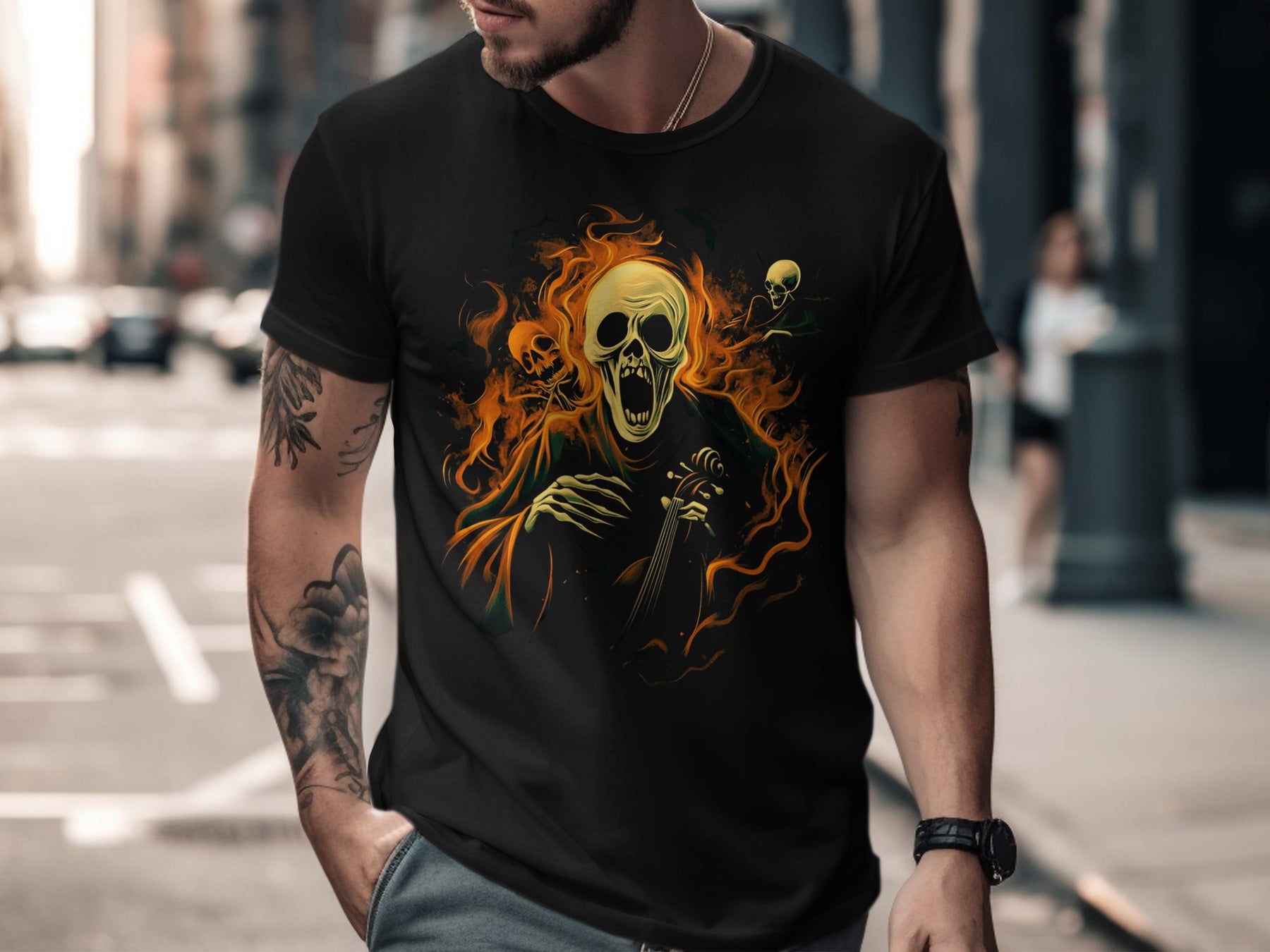 Halloween T-Shirt for Men that brings a scream to the stage. Meet the Hellfire Violin Ghoul—an open-mouthed skull in flowing robes, clutching a fiddle as flames curl and shadows swirl.
