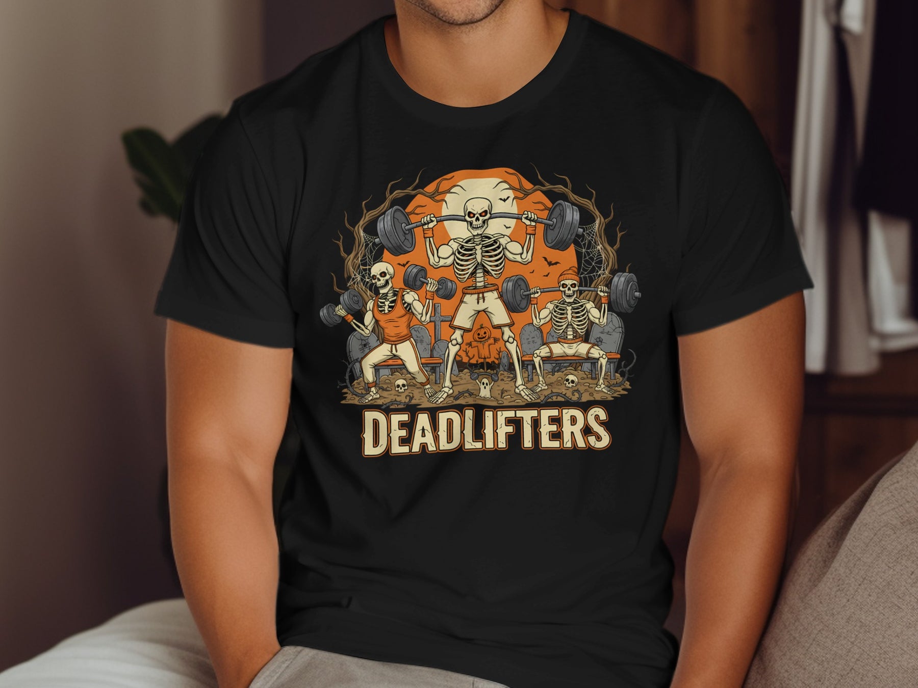 Halloween T-Shirt for Men that raises more than spirits. Deadlifters Gym features three skeleton lifters crushing sets in a moonlit graveyard—benches, barbells, webs, and wicked grins included.