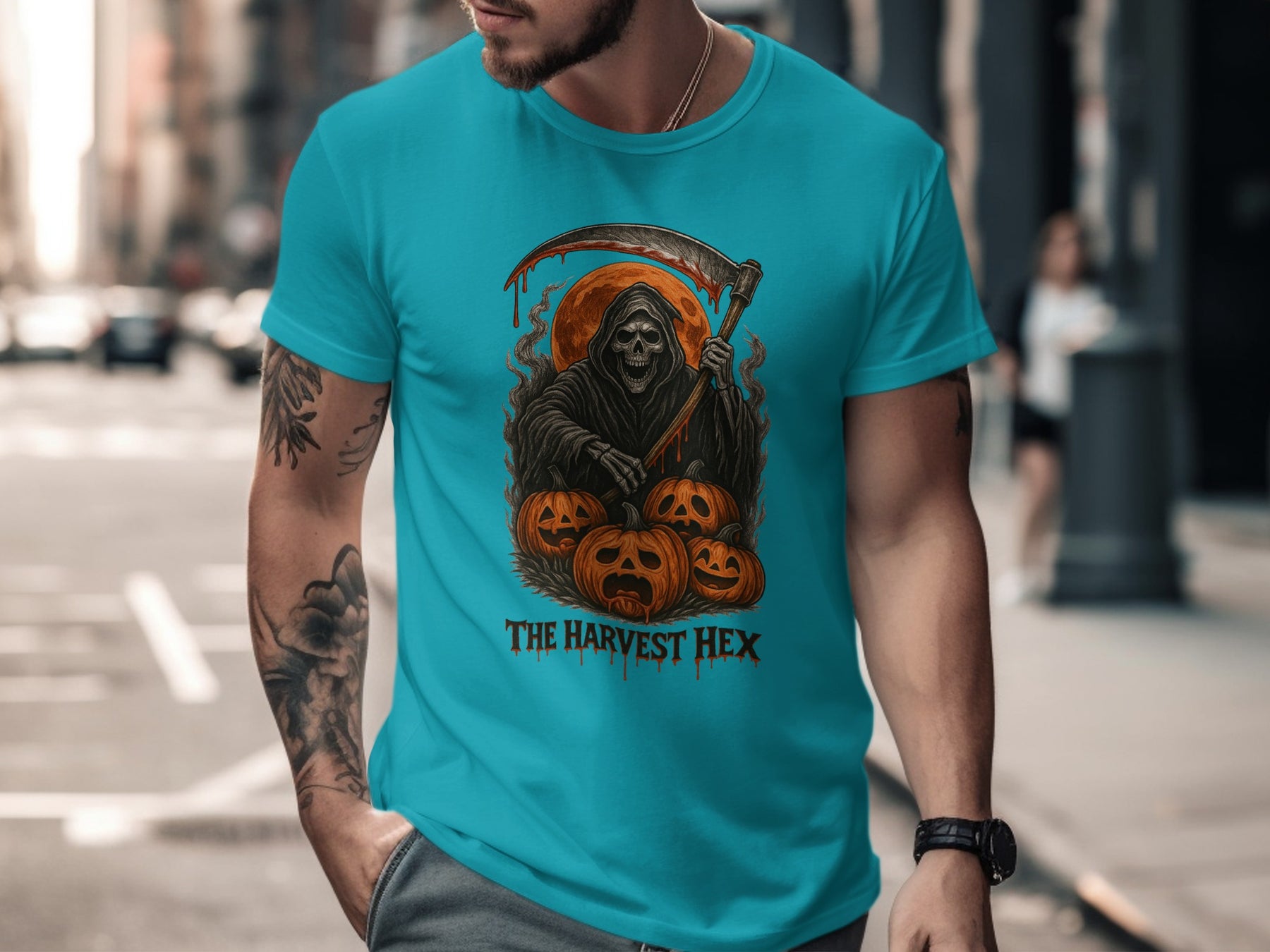 Person wearing a sky blue t-shirt with a graphic design of a Grim Reaper and pumpkins, with 'The Harvest Hex' text.