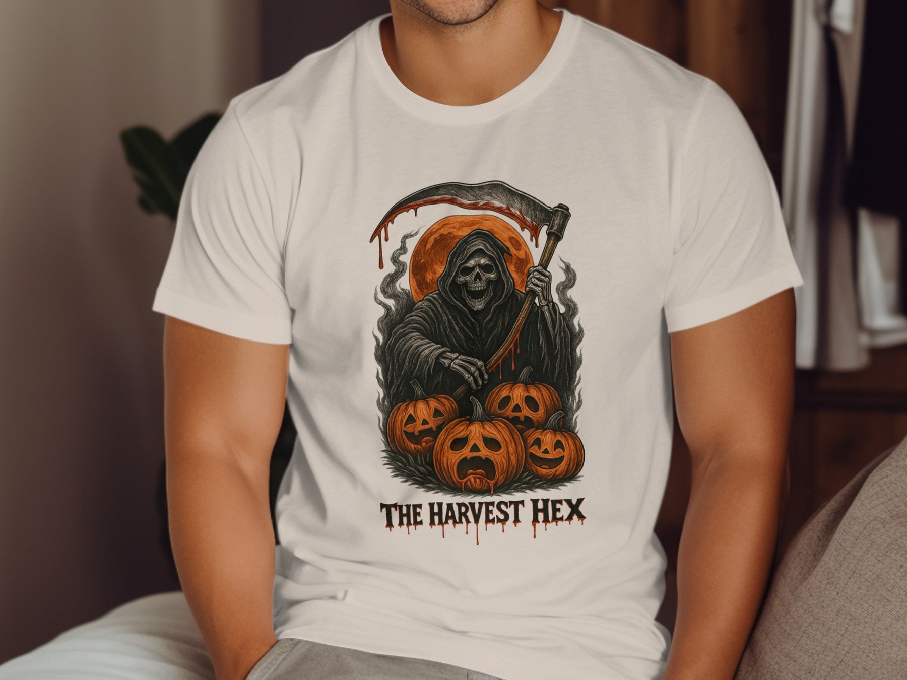 Person wearing a sand color t-shirt with a graphic design of a Grim Reaper and pumpkins, labeled 'The Harvest Hex'.