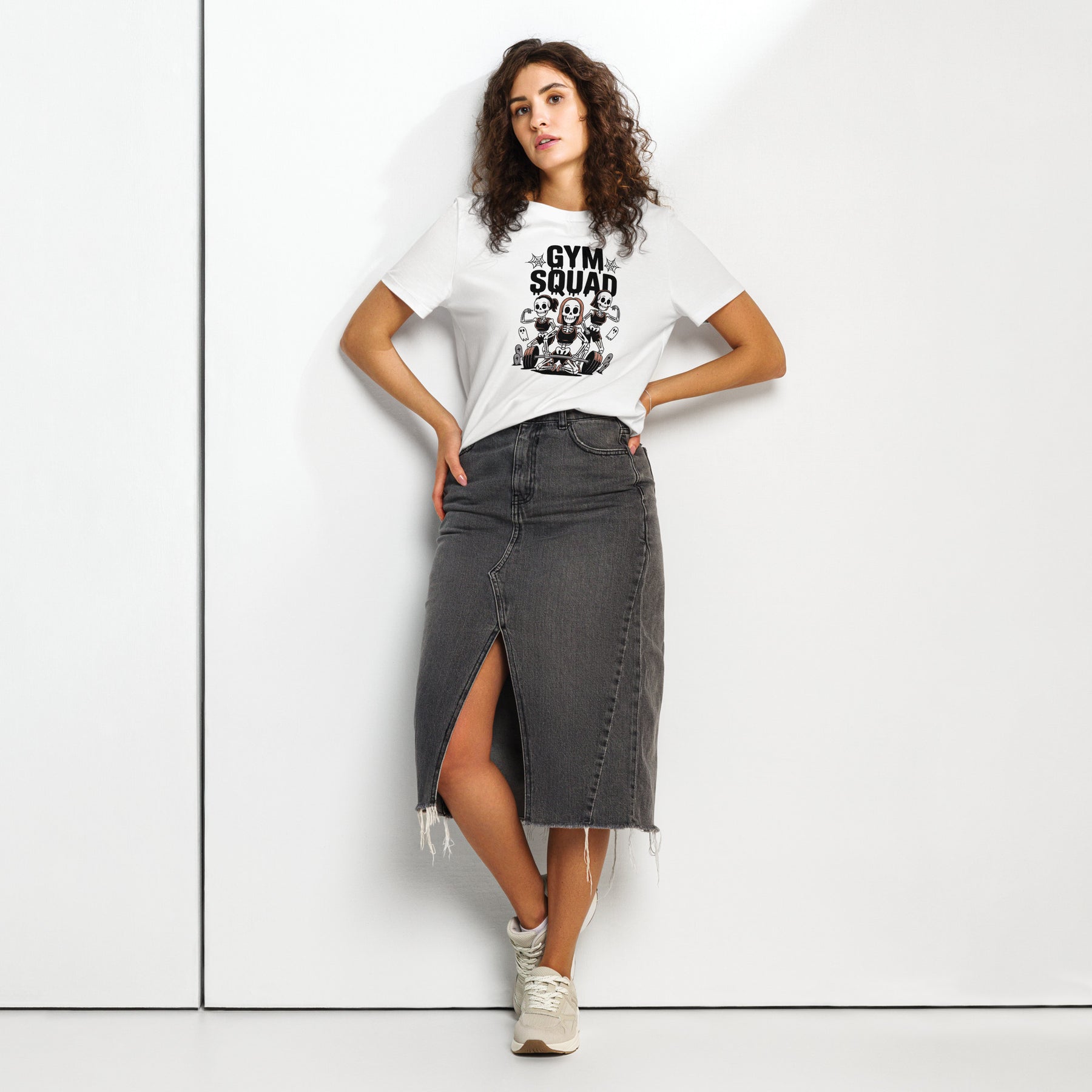 Women’s Halloween t-shirt with fierce, funny gym vibes. Three skeleton lifters in matching sets take on a monster deadlift—ghost spotters, barbell plates, and bold “GYM SQUAD” energy included. Consider it your spooky-season pump cover that still looks polished.