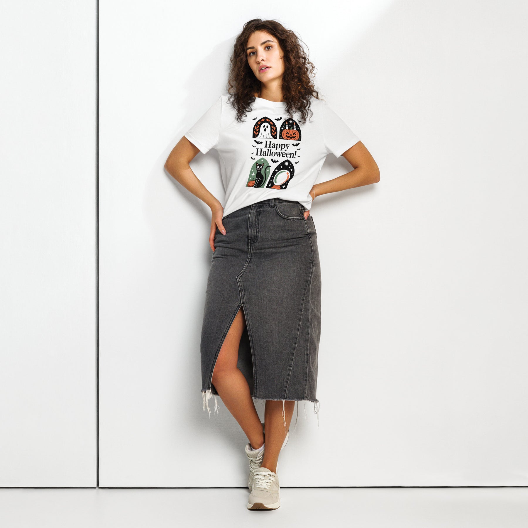 Women’s Halloween t-shirt magic meets cozy fall style. This “Happy Halloween” panel design stacks four cathedral-style windows: a friendly ghost framed in laurel, a grinning jack-o’-lantern with candles, a sleek black cat beside a pumpkin, and a starry crystal ball. It’s festive, cute, and perfect for your Holiday Drop.