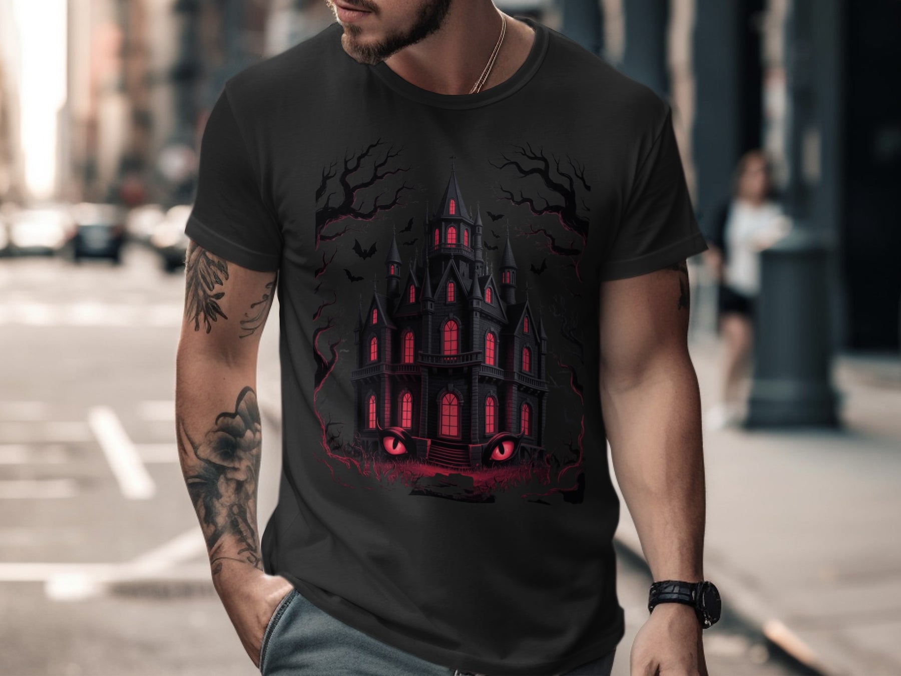 Men’s Halloween T-Shirt with “Crimson Watch Manor” artwork. Step into spooky season with a towering gothic mansion glowing blood-red while twisted trees and circling bats close in. Watchful eyes rise from the ground for a chilling finish. This Men’s Halloween T-Shirt delivers bold, high-contrast detail perfect for our limited holiday drop.