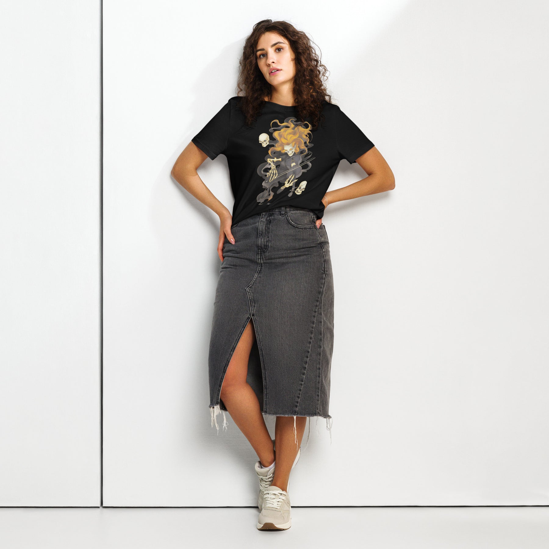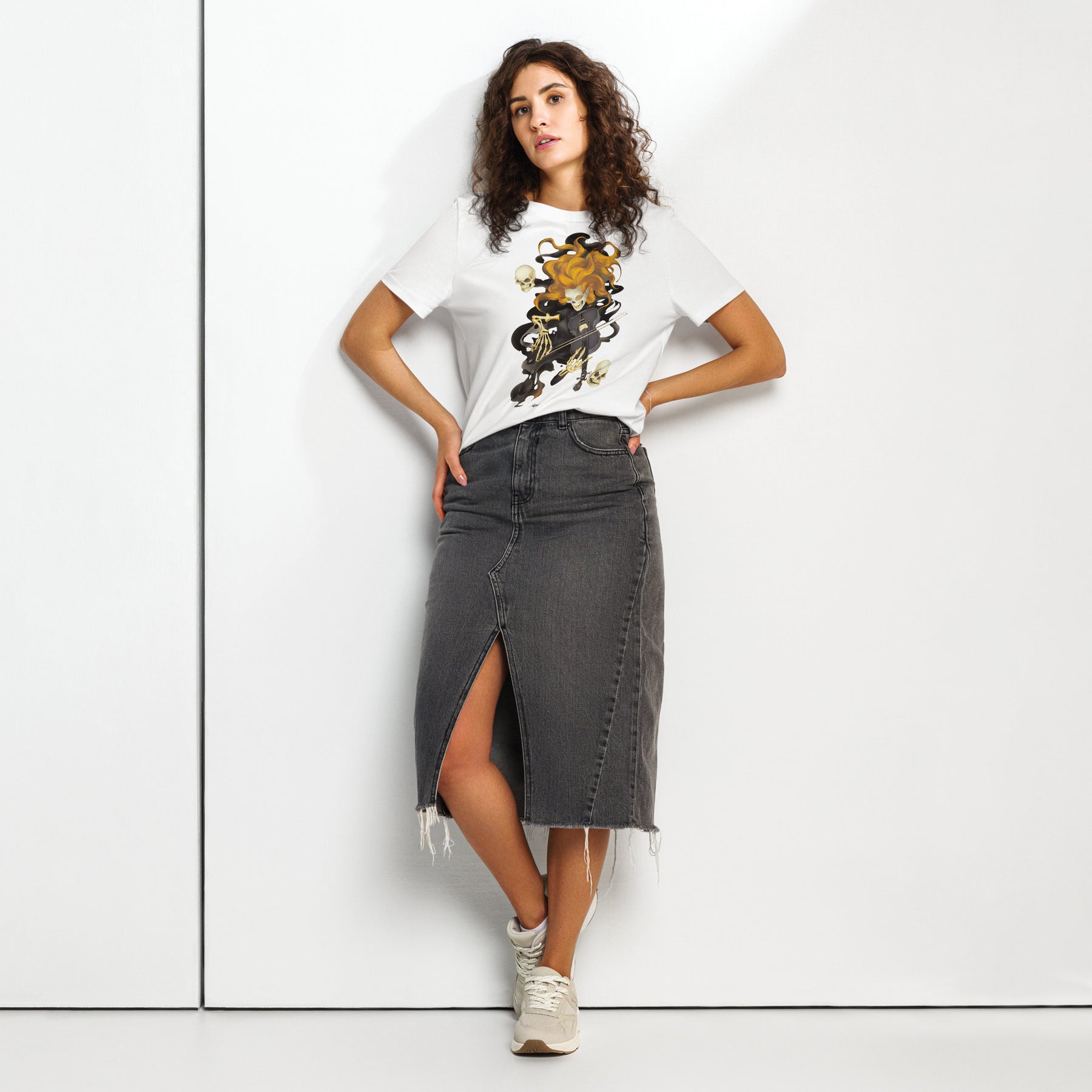 Women’s Halloween t-shirt energy for music lovers and midnight mischief. Our Inferno Violinist features a flame-haired skeleton shredding a dark violin while smoky skulls swirl around—eerie, artsy, and made to stand out.