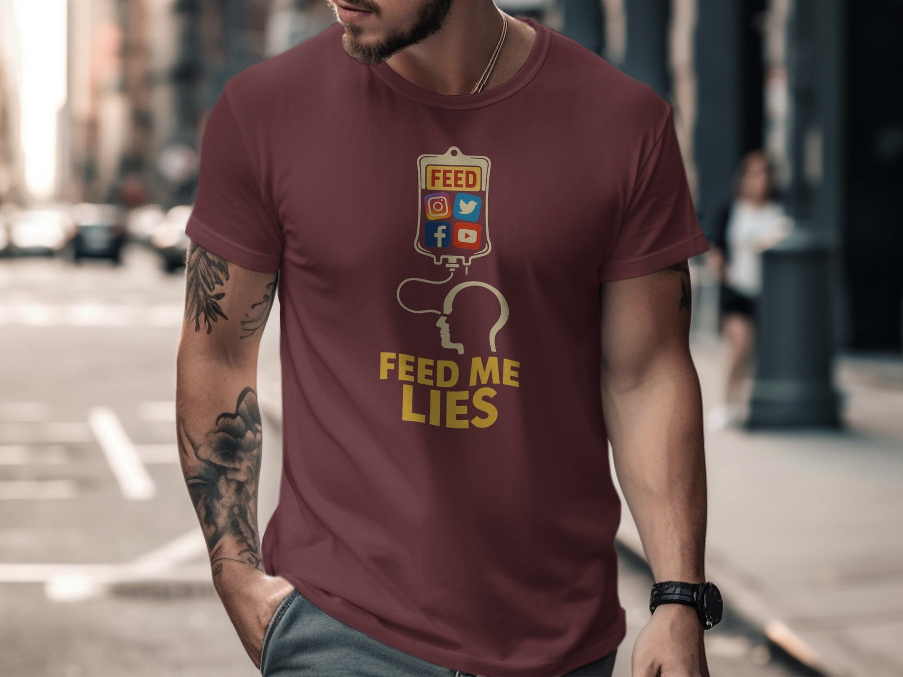 Unplug the drip. Add the Feed Me Lies t-shirt for men to cart and start the convo today. 🧠📵