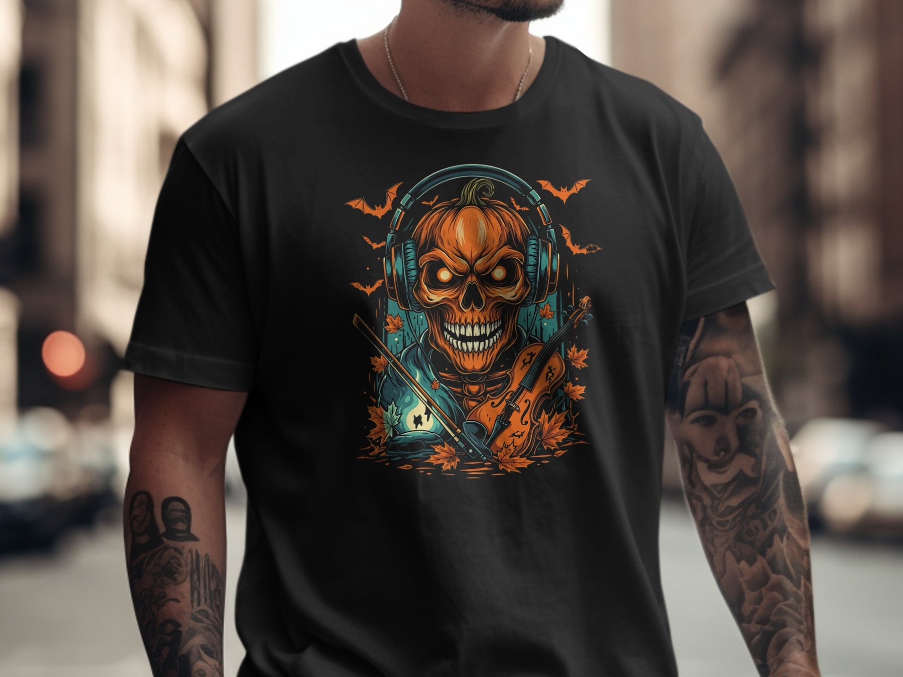 Halloween T-Shirt for Men that dials spooky season to max volume. A sinister pumpkin skull in oversized headphones grins beside a violin and bow, surrounded by bats, firelight and falling leaves.