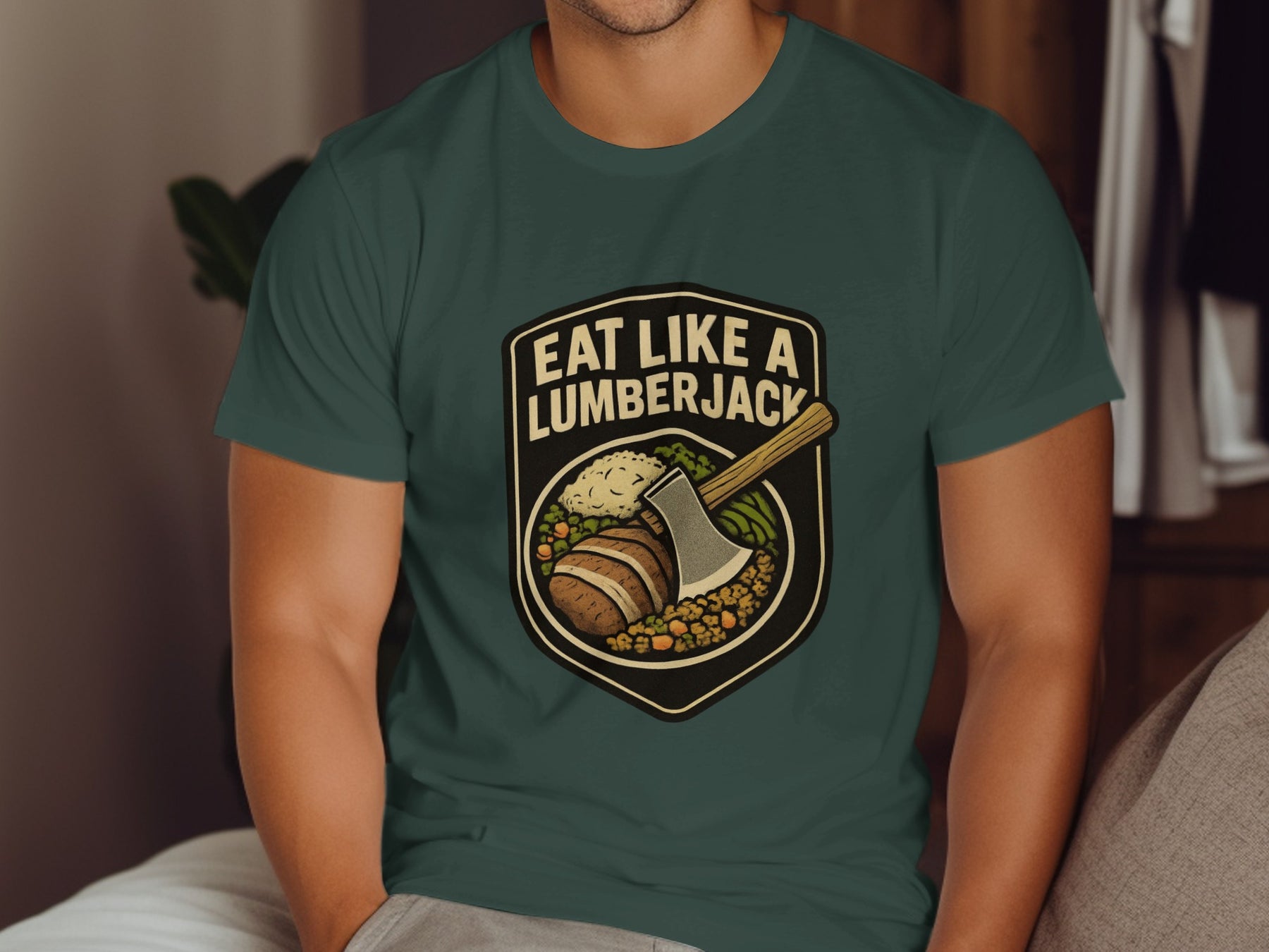 Lumberjack Thanksgiving T-Shirt for Men. Eat big with our badge-style graphic that declares “Eat Like a Lumberjack.” This Lumberjack Thanksgiving T-Shirt drops a rugged axe across a fully loaded plate—mashed potatoes, greens, and all—framed in a vintage shield that pops on any colour tee.