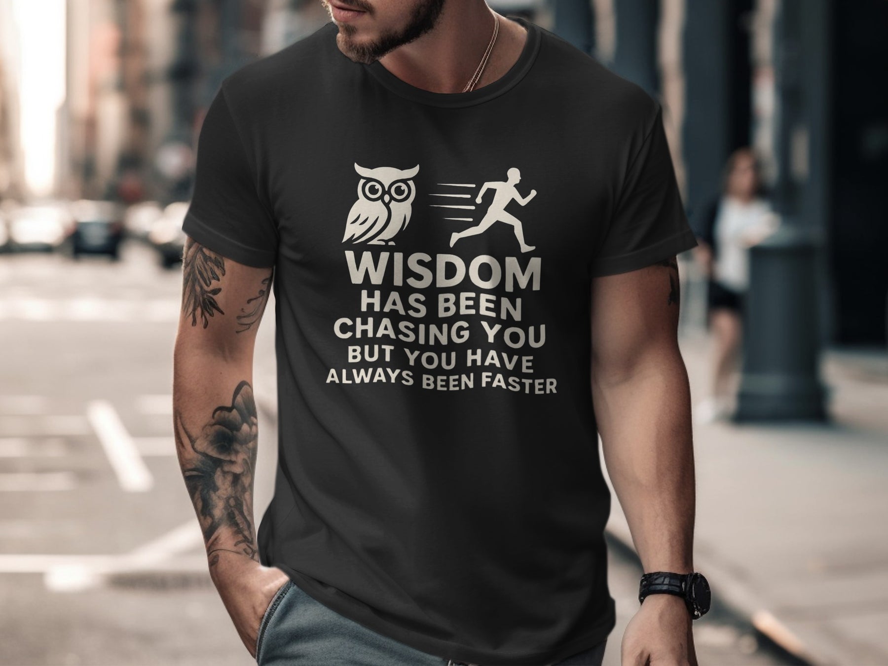 Funny wisdom t-shirt for men who outrun lectures. An owl watches a runner sprint past the punchline—smart humour (and a little self-roast) you can wear anywhere.