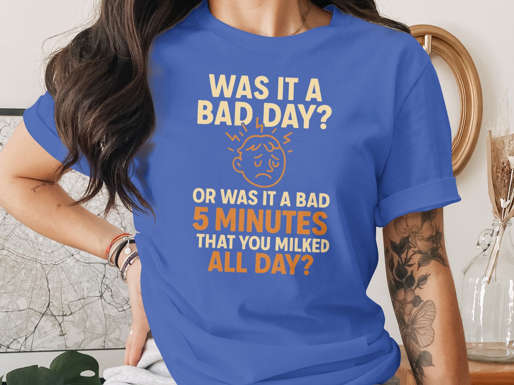 Funny bad day t-shirt to flip the script when life gets loud. The cheeky reminder—“Was it a bad day, or a bad 5 minutes you milked all day?”—keeps perspective front and center.