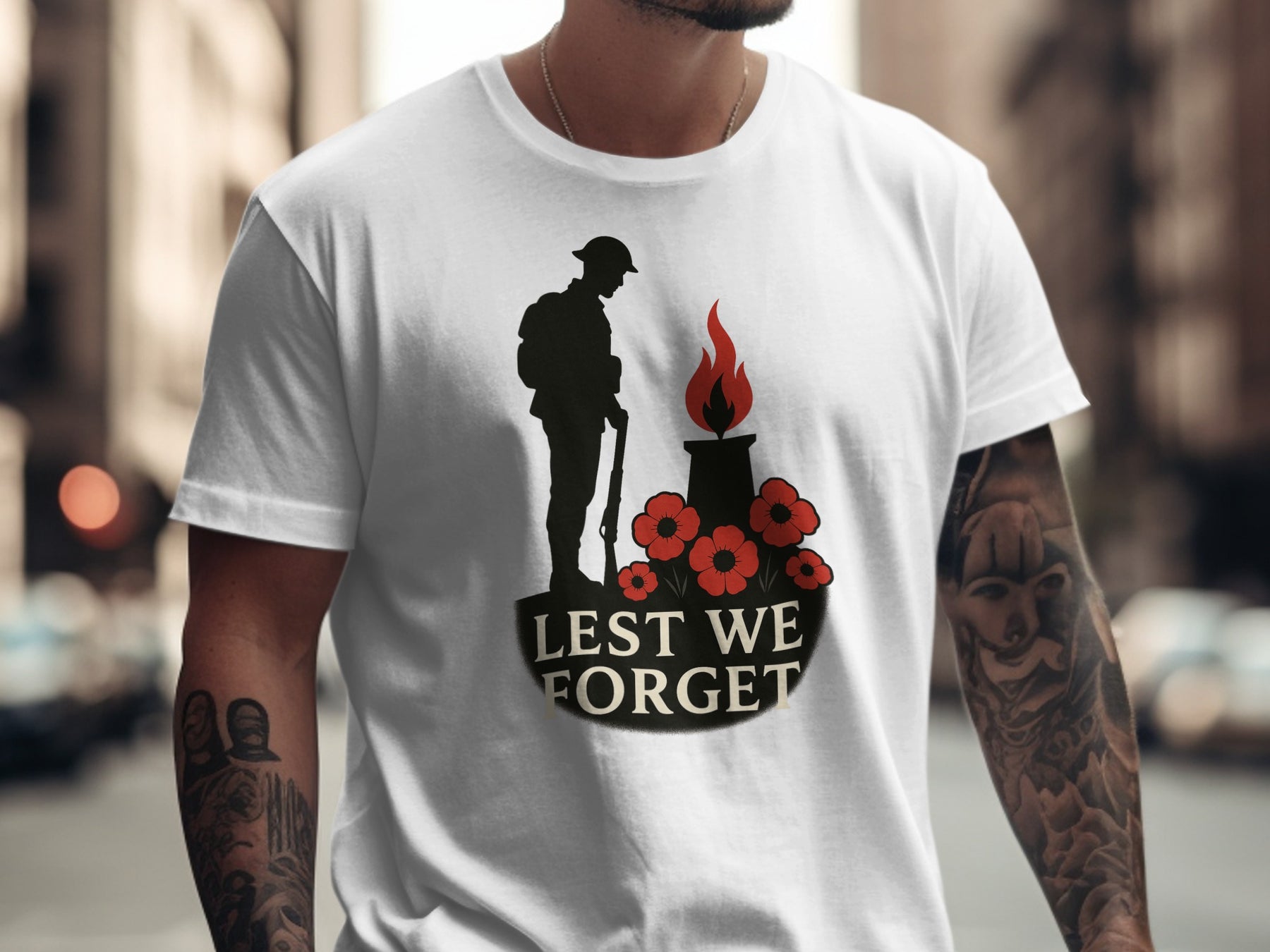 Remembrance Day men’s t-shirt that speaks with quiet dignity. A solemn soldier silhouette stands beside an eternal flame and a ring of poppies over the words “Lest We Forget.” This respectful Remembrance Day men’s t-shirt is made for ceremonies and everyday gratitude.