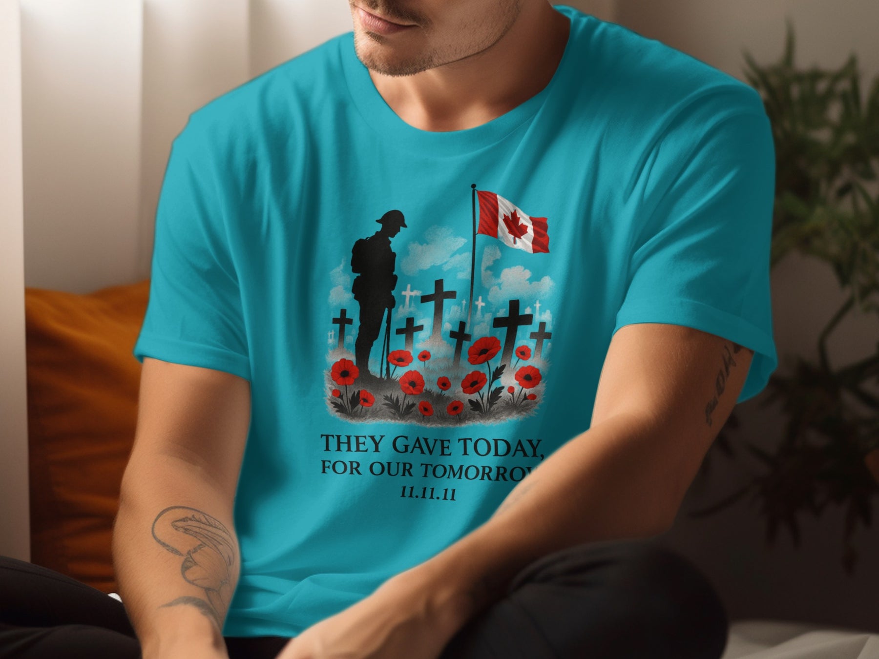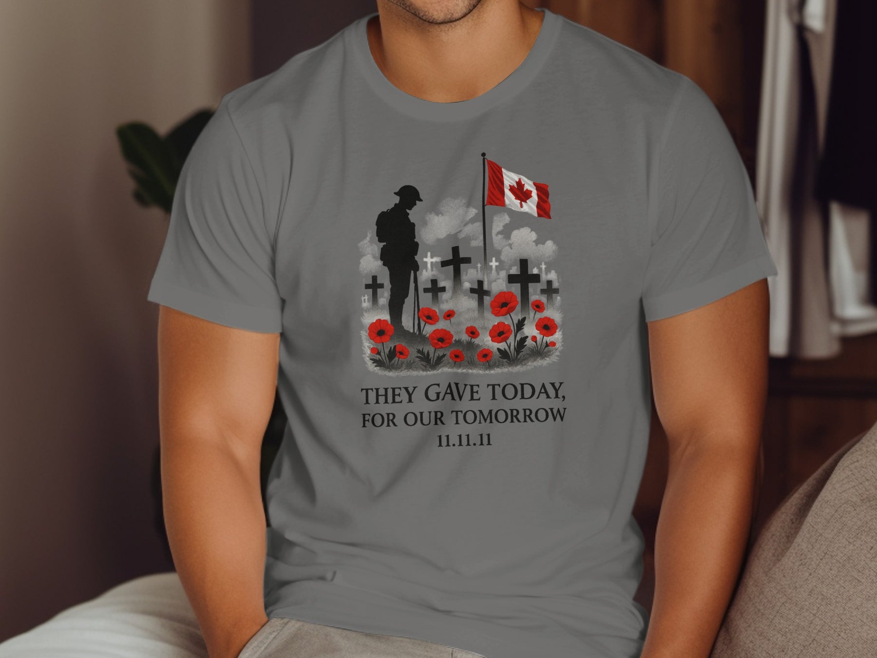 Remembrance Day T-shirt for men that pays tribute with quiet dignity. A soldier silhouette stands among memorial crosses beneath a waving Canadian flag, surrounded by bold red poppies and the message “They gave today, for our tomorrow • 11.11.11.” This Remembrance Day T-shirt pairs meaningful art with an easy, everyday fit.
