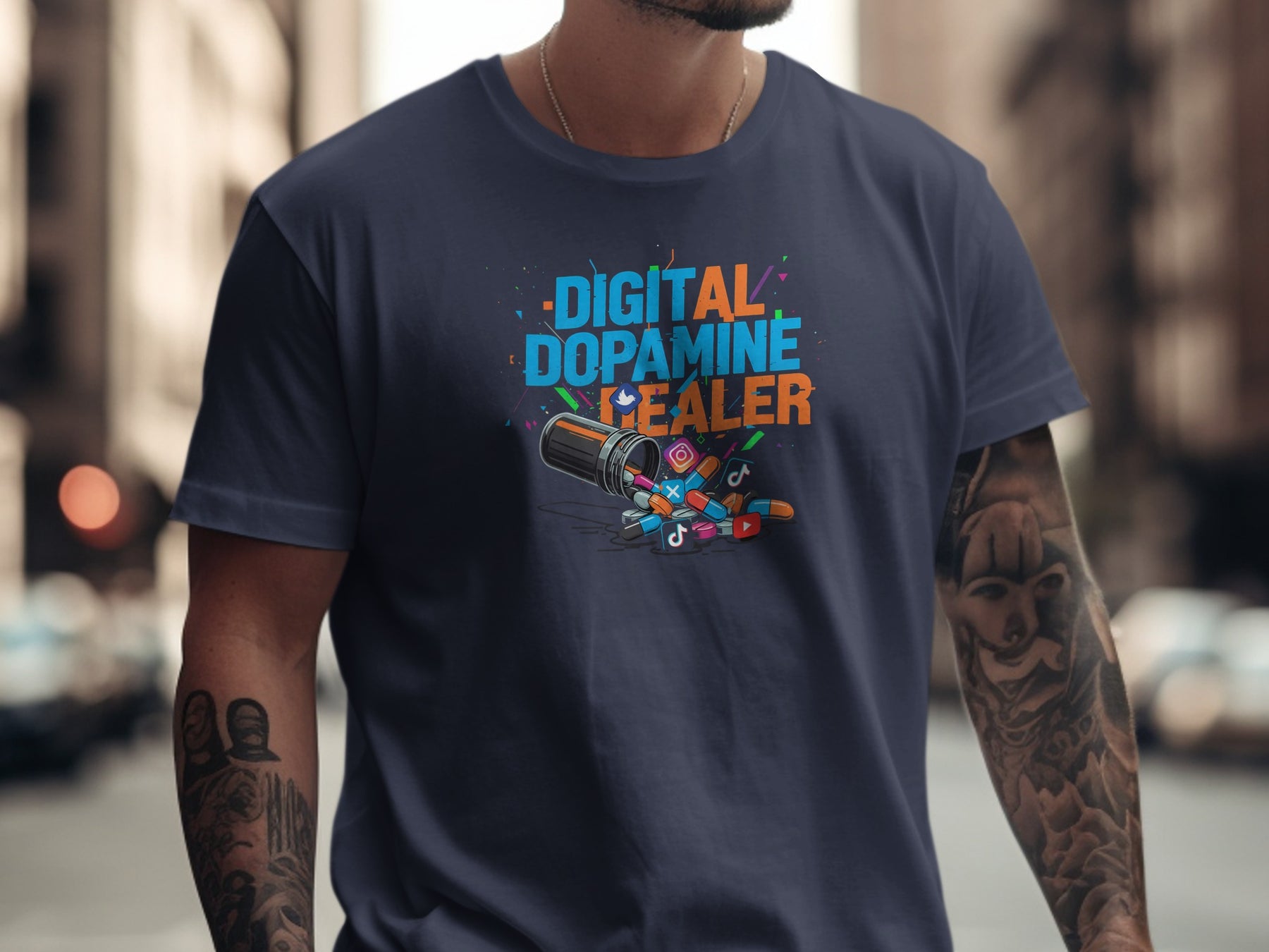Digital Dopamine Dealer men’s t-shirt. This sharp statement tee flips the script on the scroll: a toppled pill bottle spills colourful “likes” and alerts as capsules—spotlighting how our feeds are engineered for hits, not health.