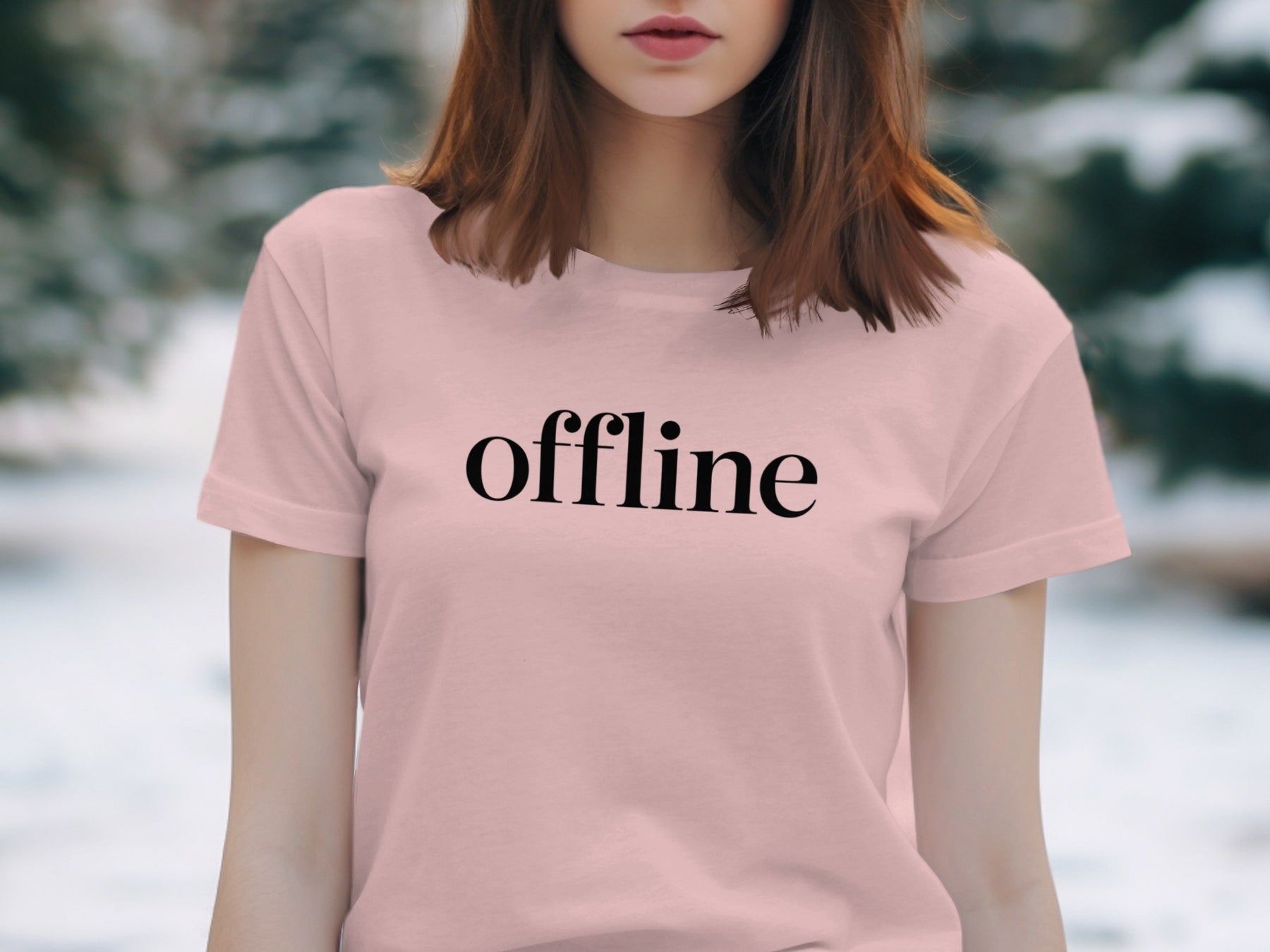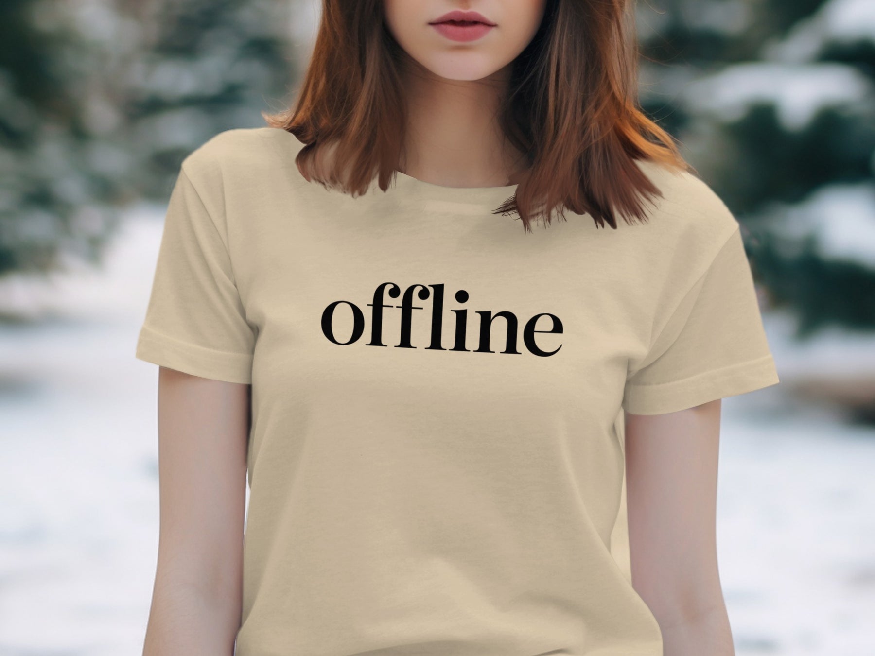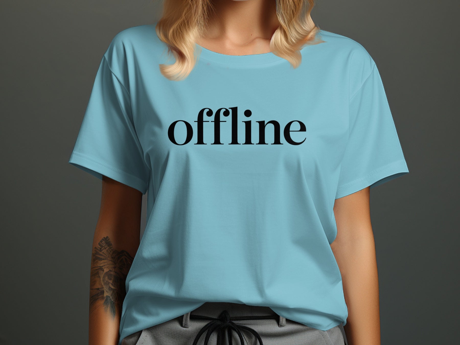 Offline women’s t-shirt. A quiet flex for the attention economy, this minimalist wordmark sets your status to present while everything else stays sleek and distraction-free.