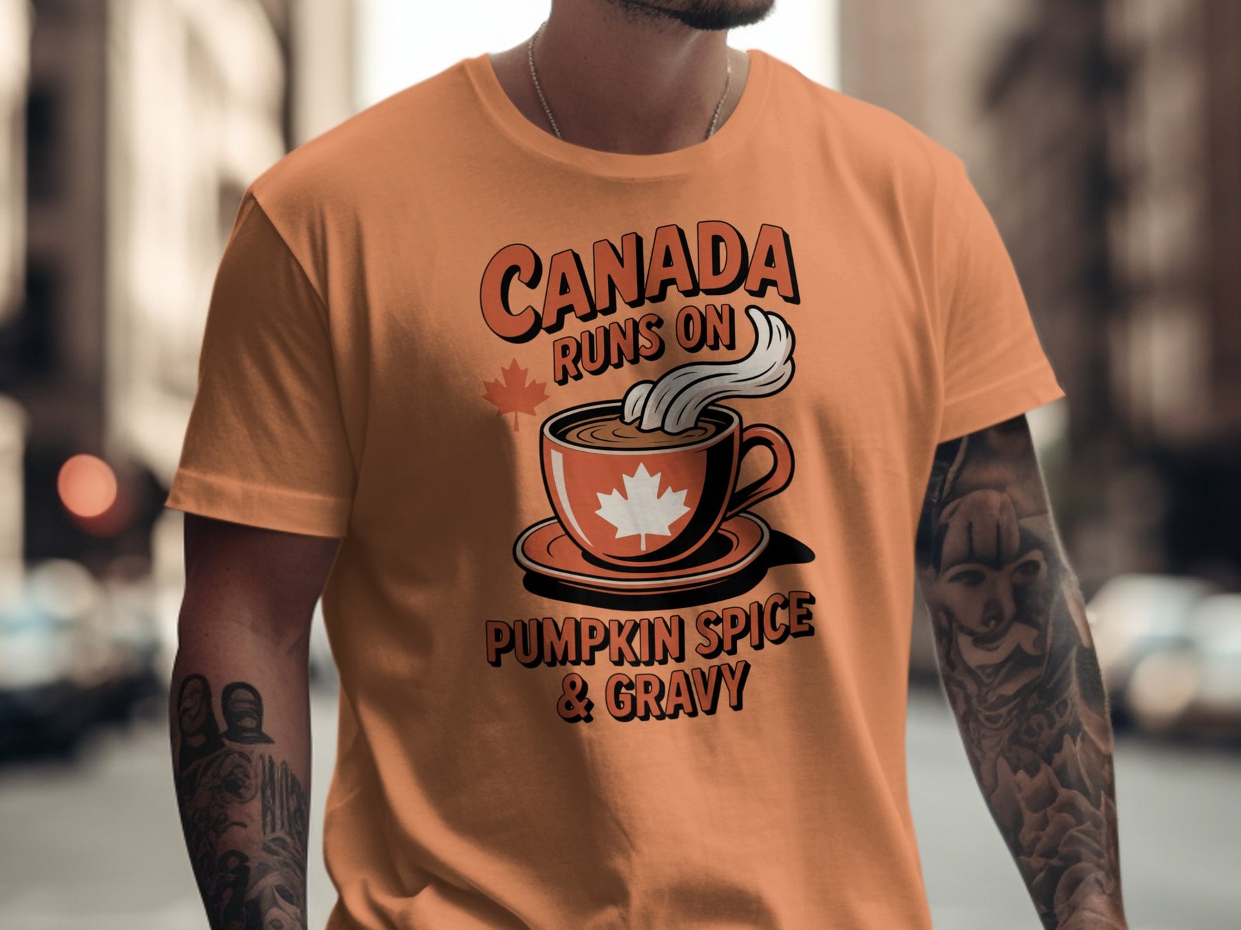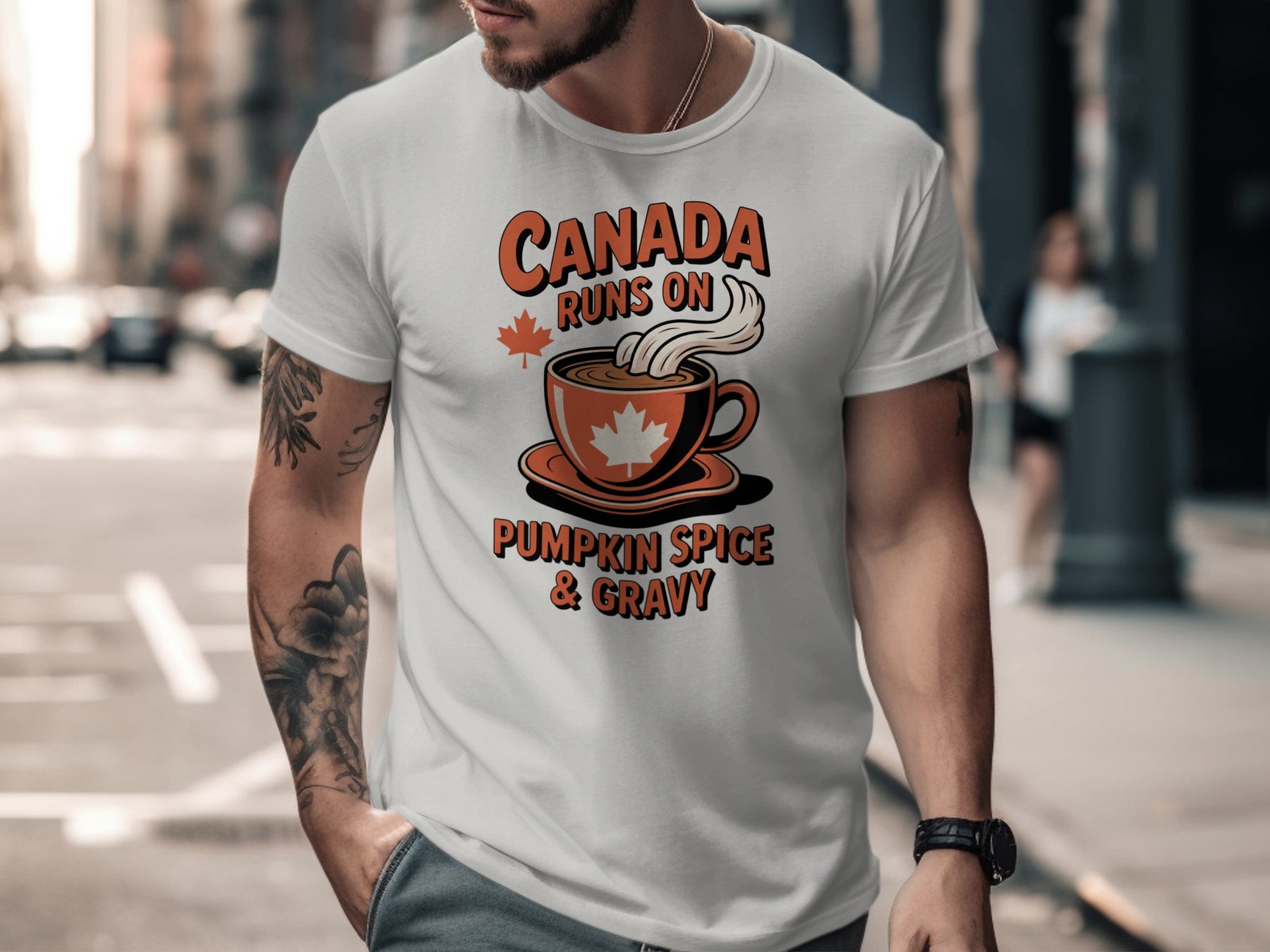 Thanksgiving men’s T-shirt with coffee cup maple leaf graphic and “Canada runs on pumpkin spice & gravy” text