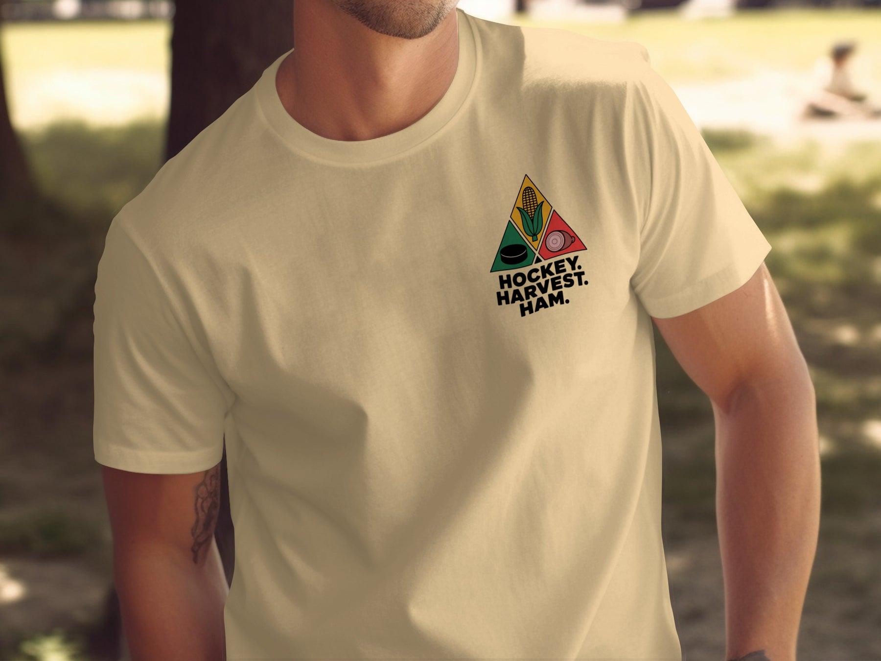 Thanksgiving hockey t-shirt for guys who live for puck drop and pie. Our “Hockey. Harvest. Ham.” graphic stacks a bold triangle of icons—corn, puck, and ham—clean lines and rich fall tones that pop on any base color. This Thanksgiving hockey t-shirt is built for rink-to-feast days, tailgates, and Friendsgiving.
