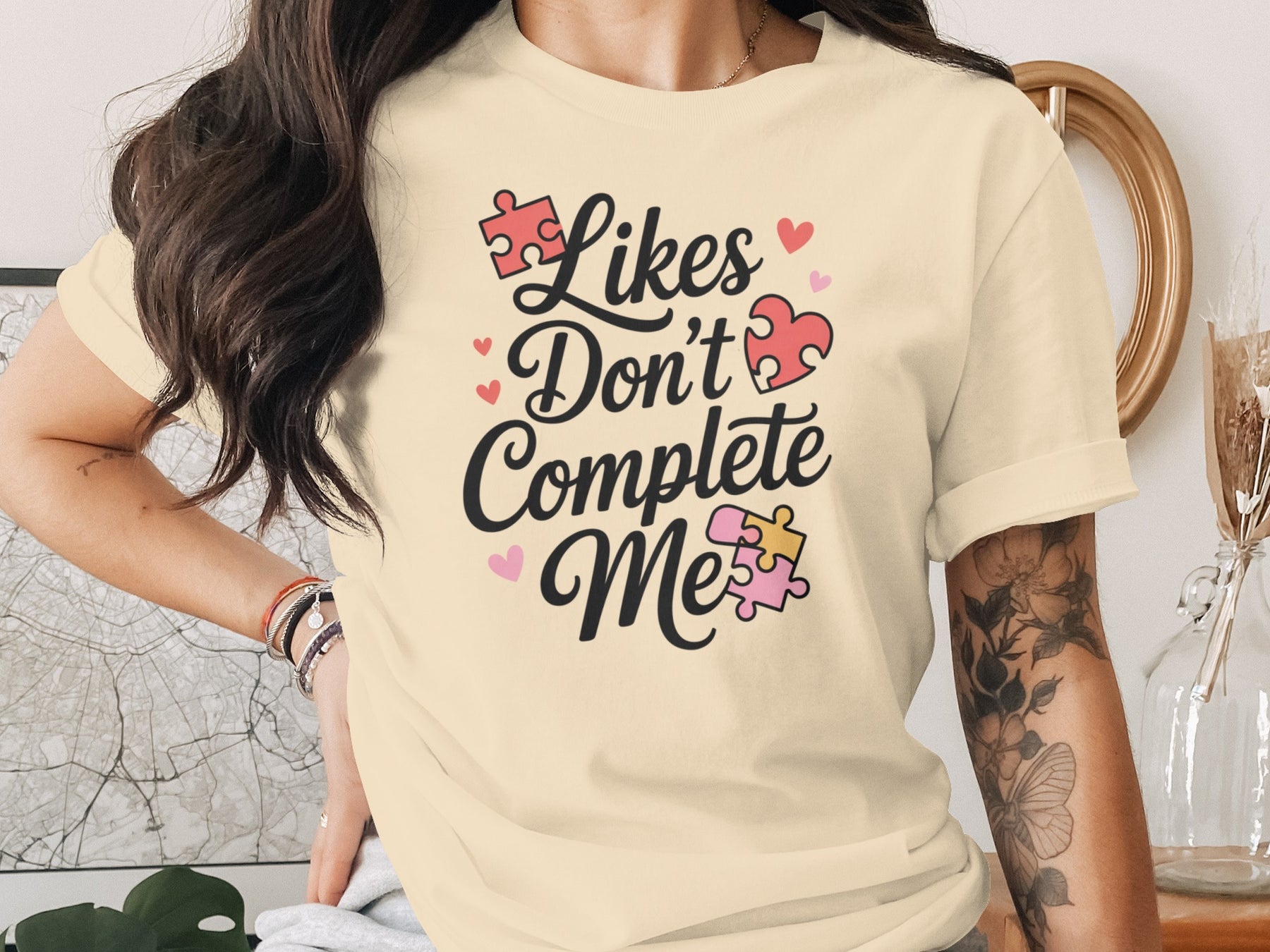 You’re already whole. Add the Likes Don’t Complete Me women’s t-shirt to cart and wear your confidence. 💖🧩