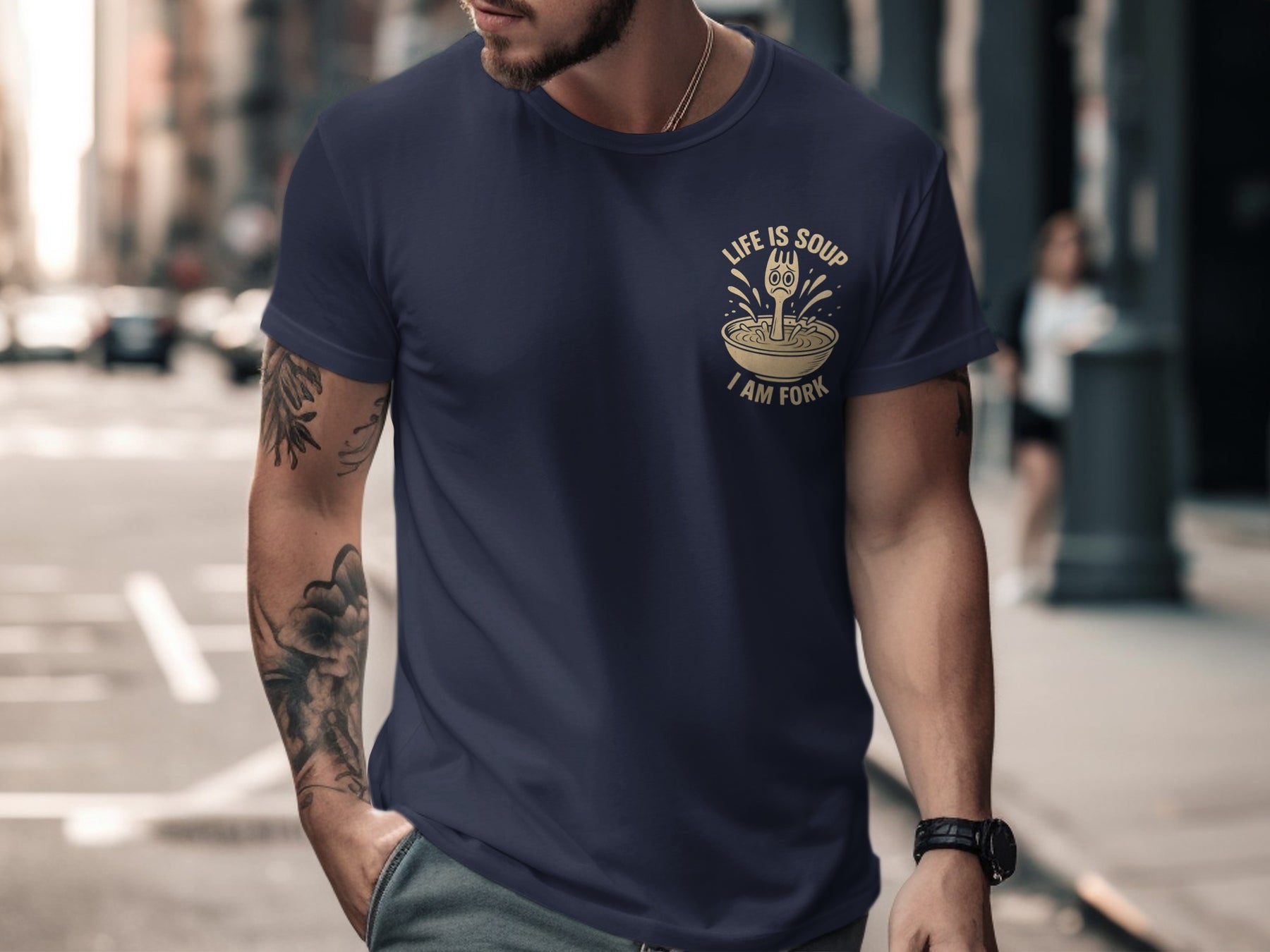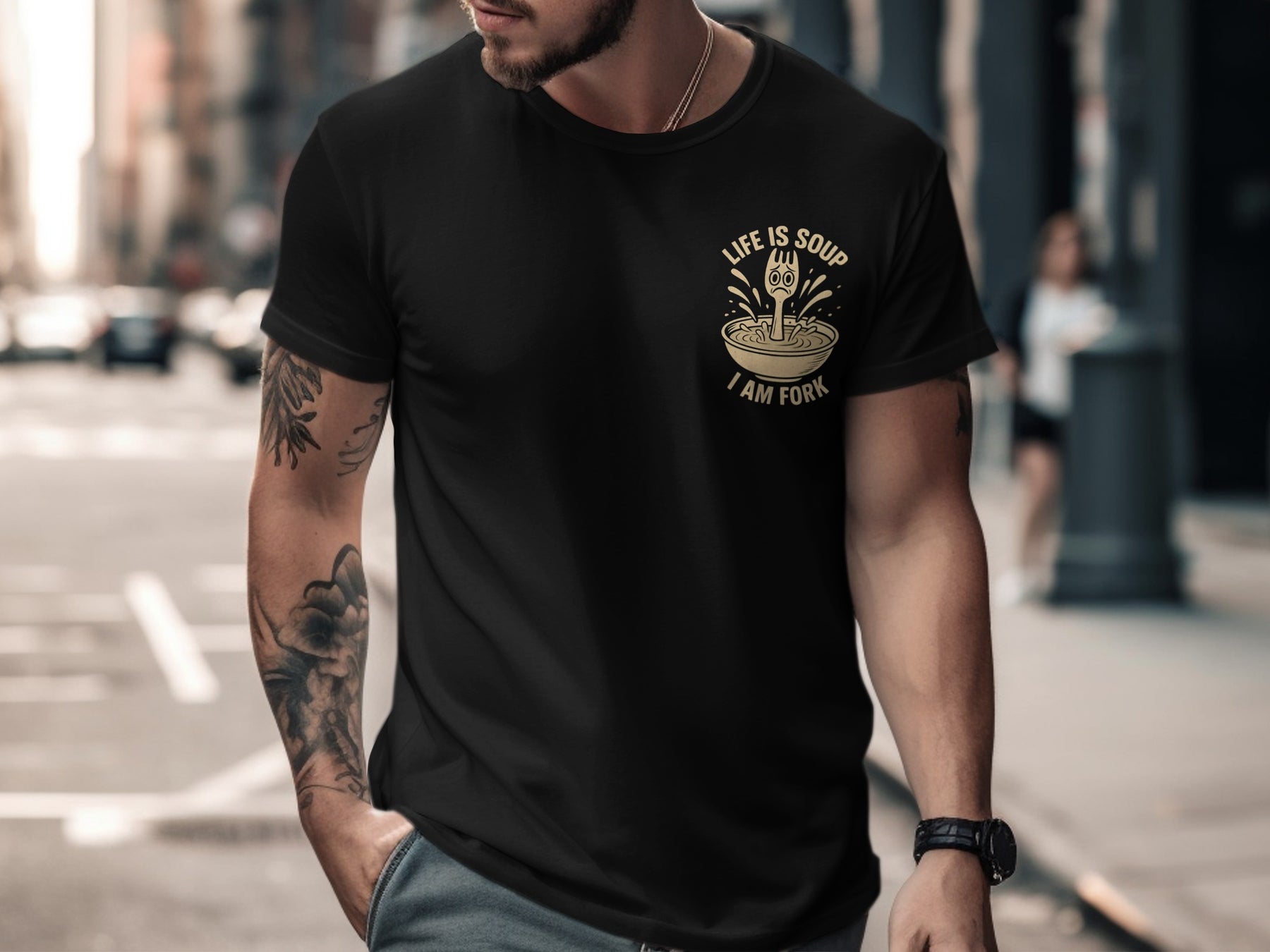 Visual vibe: Hand-drawn sad fork splashing in a soup bowl with the arched caption “Life Is Soup – I Am Fork.” Vintage cream ink on black adds a bold, high-contrast look with retro poster energy.
