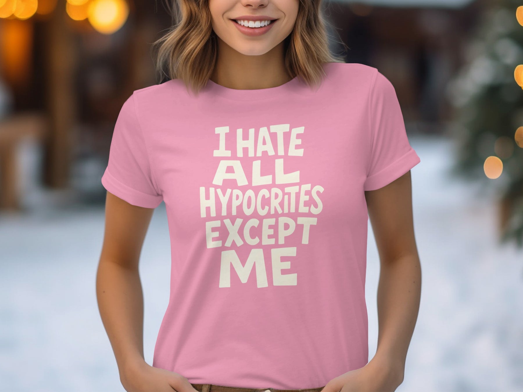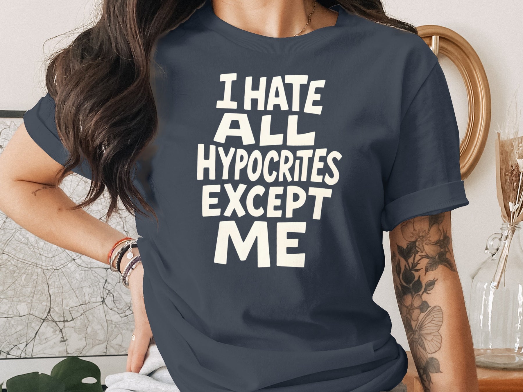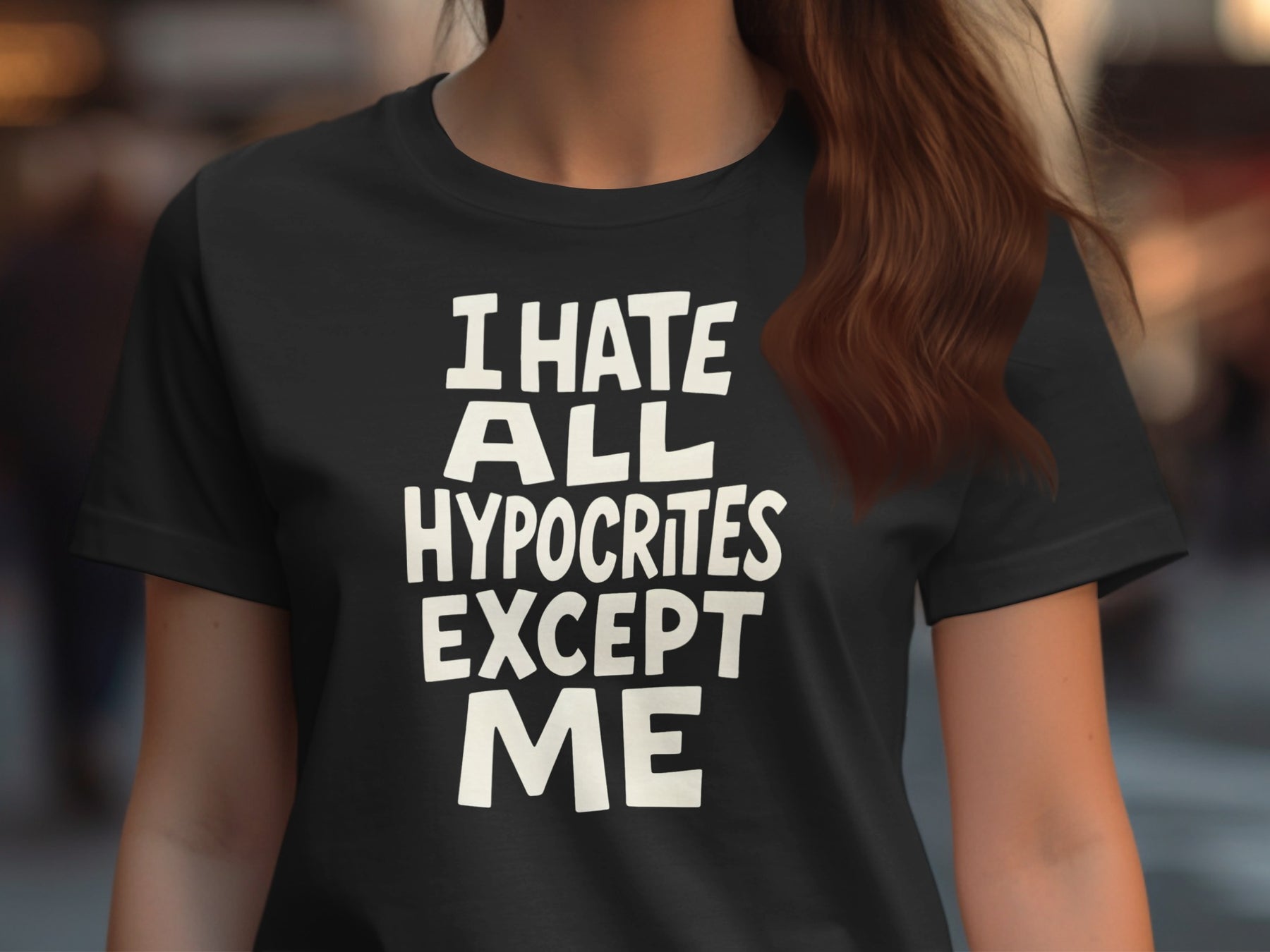 The vibe: bold hand-lettered quote—“I hate all hypocrites except me”—in chunky retro type. High-contrast art that pops on any color and pairs easily with denim or joggers.