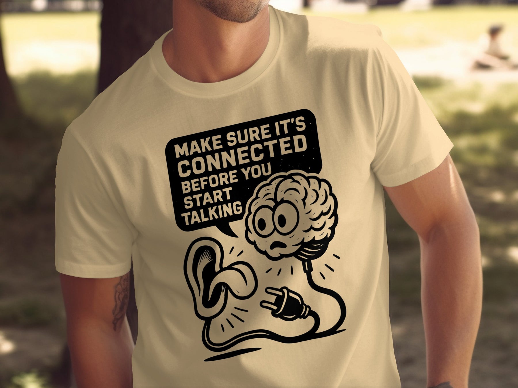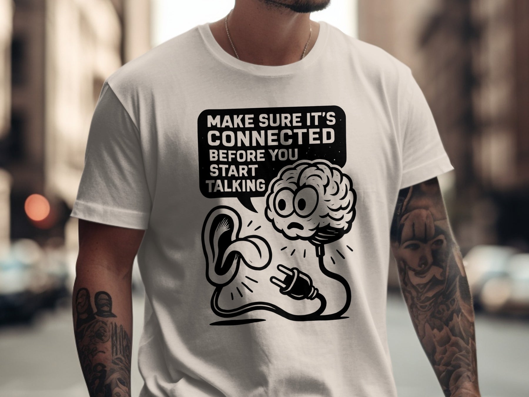 Funny men's t-shirt for guys who get the joke: connect your brain before your mouth. The bold speech bubble reads, “Make sure it’s connected before you start talking.”