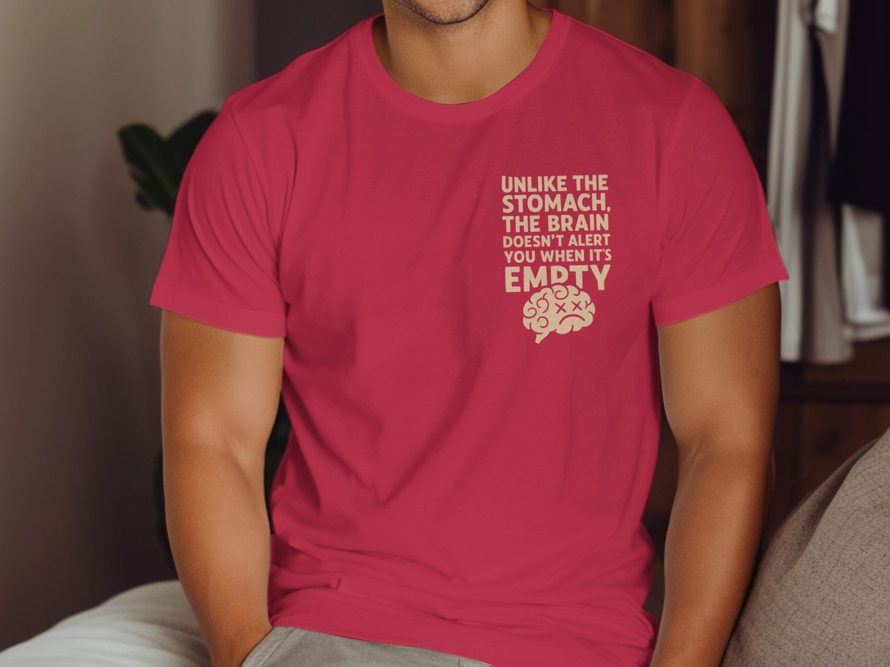 Funny men's t-shirt with a truth bomb: unlike the stomach, the brain doesn’t alert you when it’s empty. Clean block lettering and a sad cartoon brain keep the punchline bold and readable.