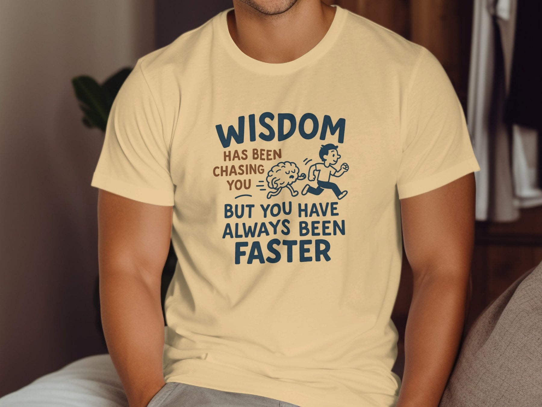 Funny men's t-shirt with a clever quote for guys who stay two steps ahead. “Wisdom has been chasing you—but you’ve always been faster” lands with that perfect wink-and-run energy.