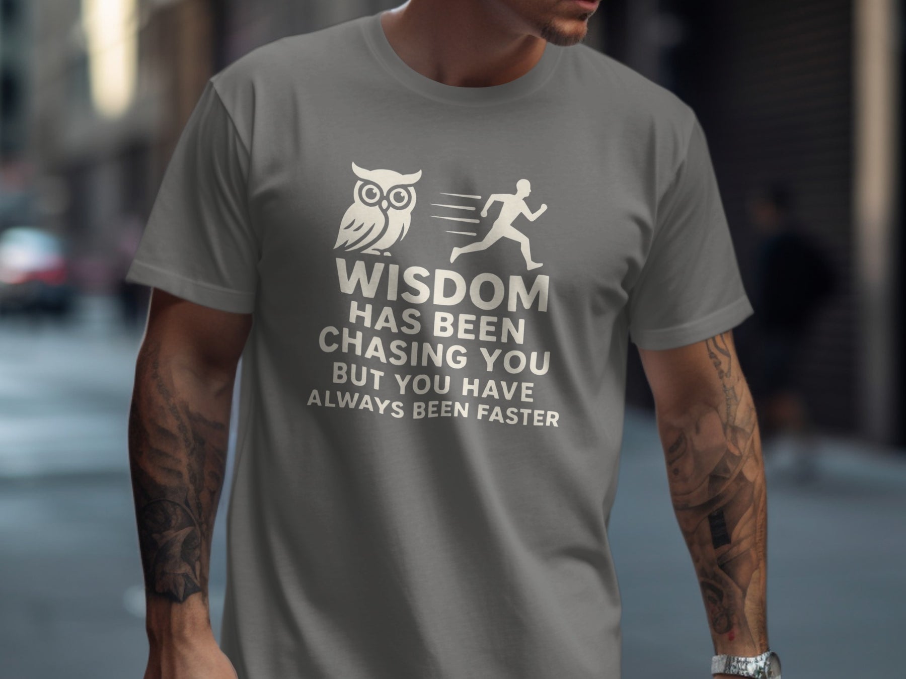 Funny men's t-shirt with a clever wink: “Wisdom has been chasing you, but you’ve always been faster.” Perfect for guys who outrun bad decisions with style.