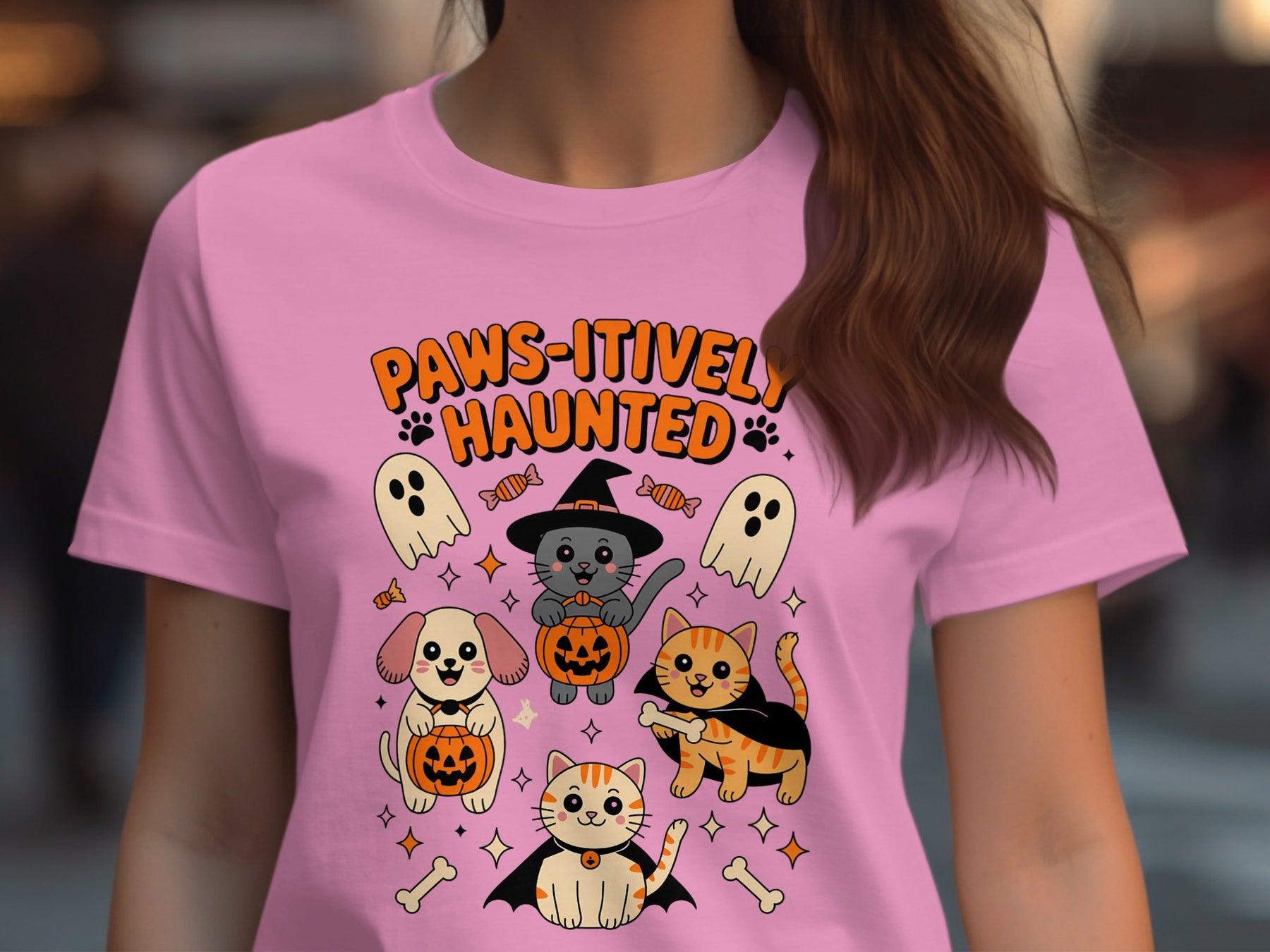 Halloween T-Shirt for Women with paw-some spooky charm: cuddly cats and a happy pup pose with jack-o’-lanterns, candy and friendly ghosts under a “Paws-itively Haunted” banner.