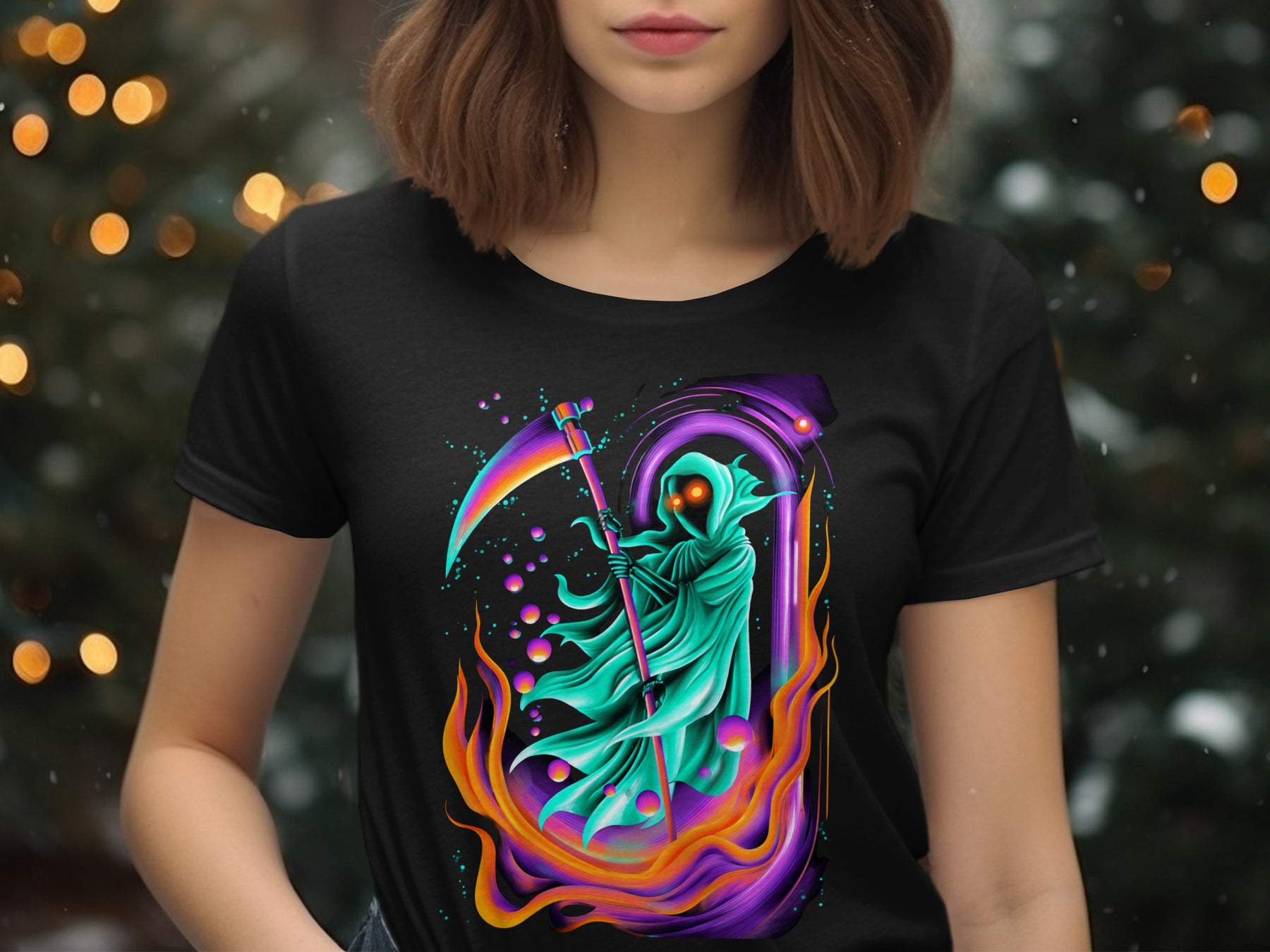 Halloween T-Shirt for Women that glows with electric energy: a cloaked reaper steps through a neon portal, eyes blazing and rainbow scythe slicing through swirling flames.