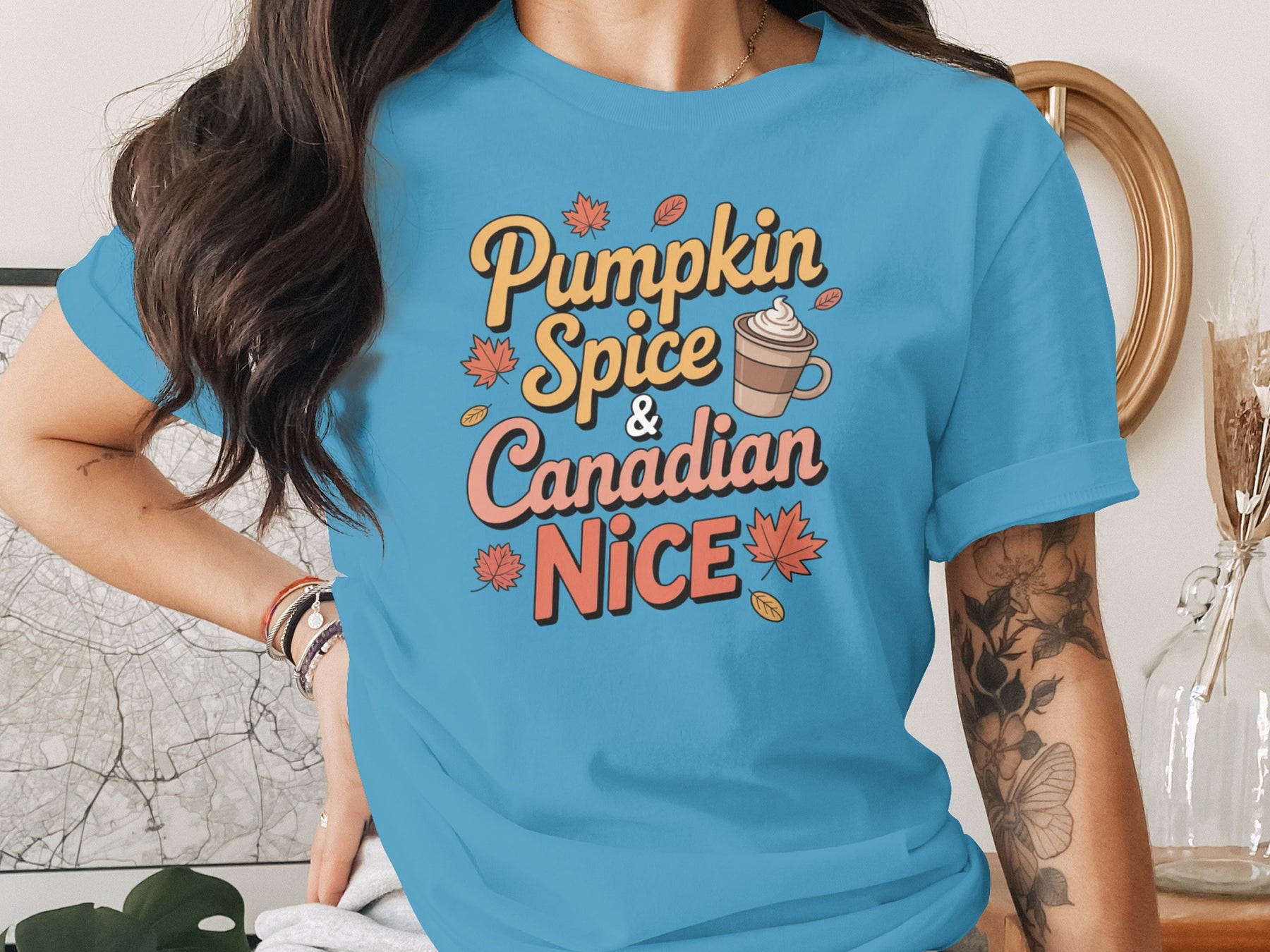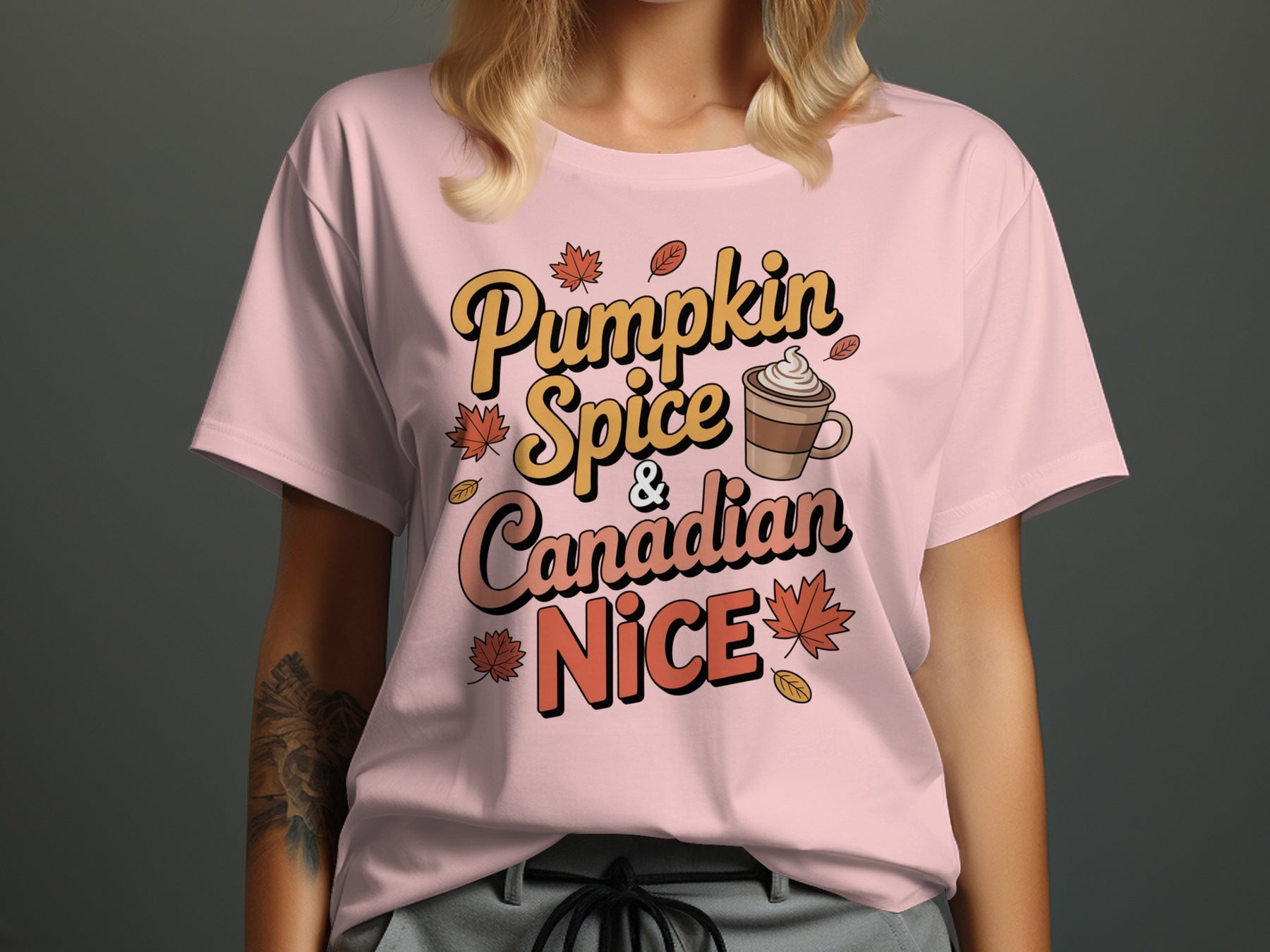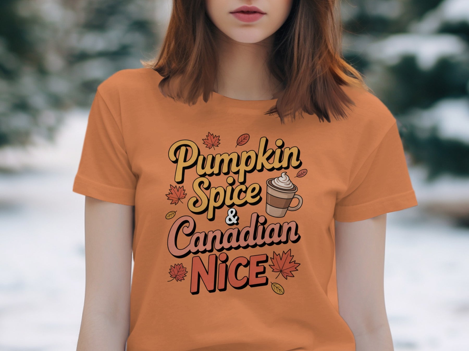 Women’s Thanksgiving T-shirt with a sweet Canadian wink. Retro lettering reads “Pumpkin Spice & Canadian Nice,” accented by a whipped-latte mug and drifting maple leaves—serving festive charm for fall festival drops.
