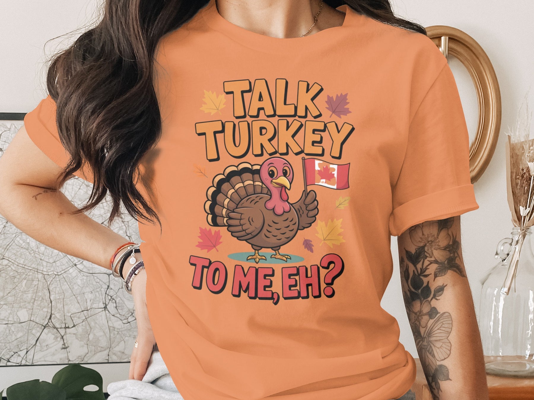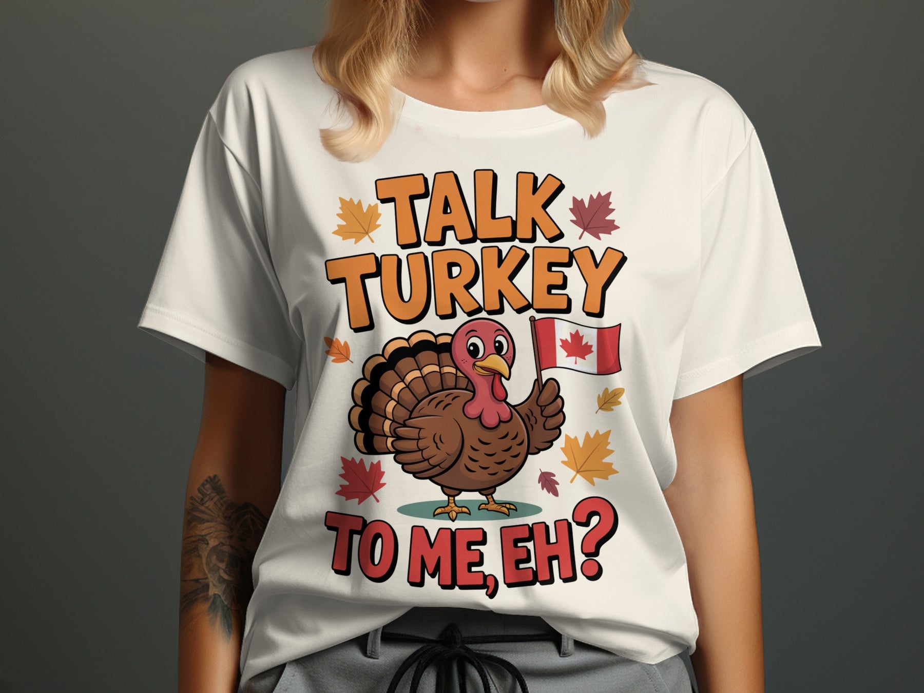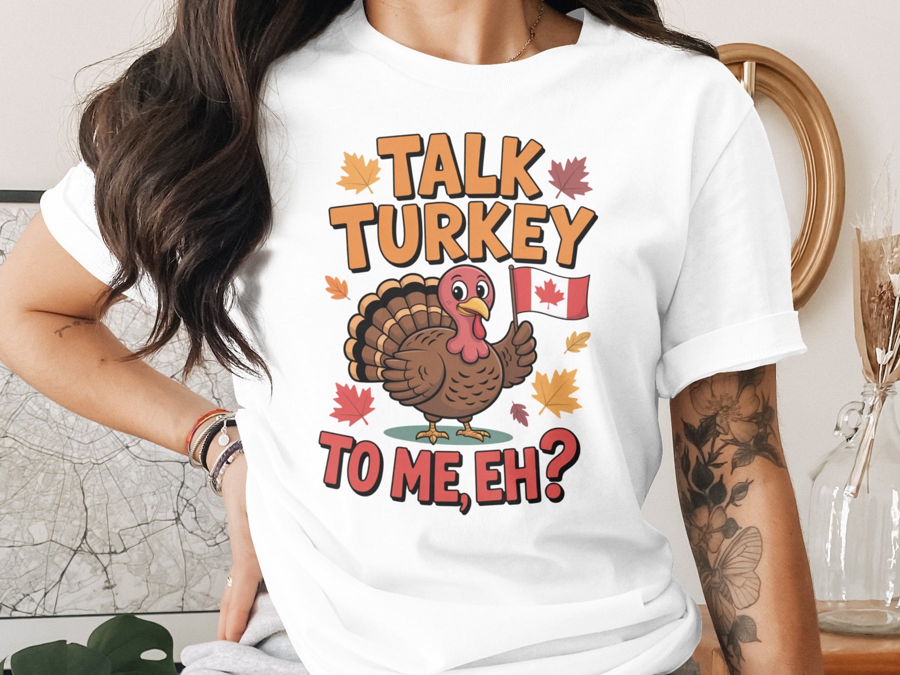 Women’s Thanksgiving T-shirt with a playful Canadian twist. A cheerful turkey waves a maple-leaf flag beneath the phrase “Talk Turkey to Me, Eh?”—a cute nod to both U.S. and 🇨🇦 feast days.