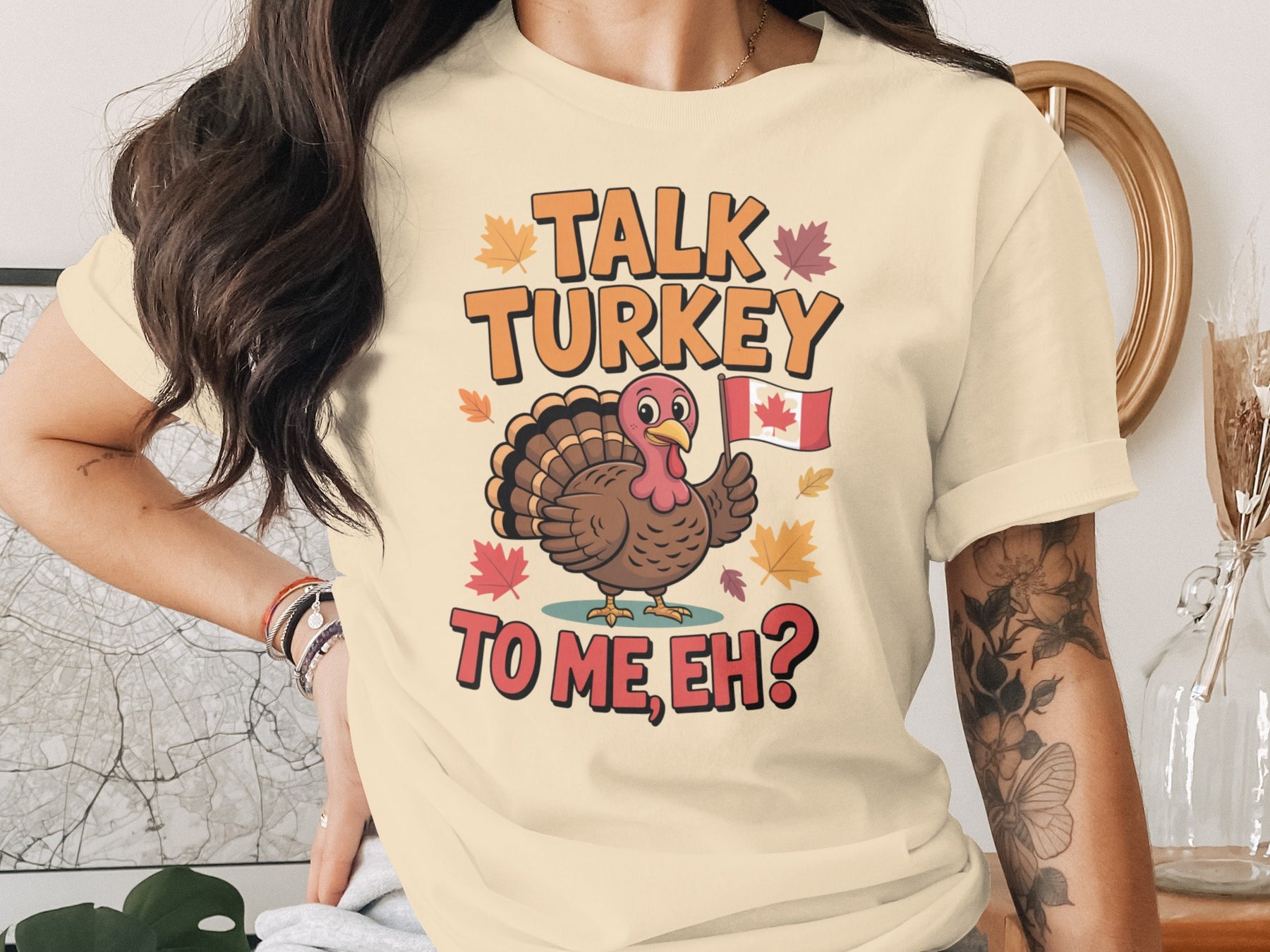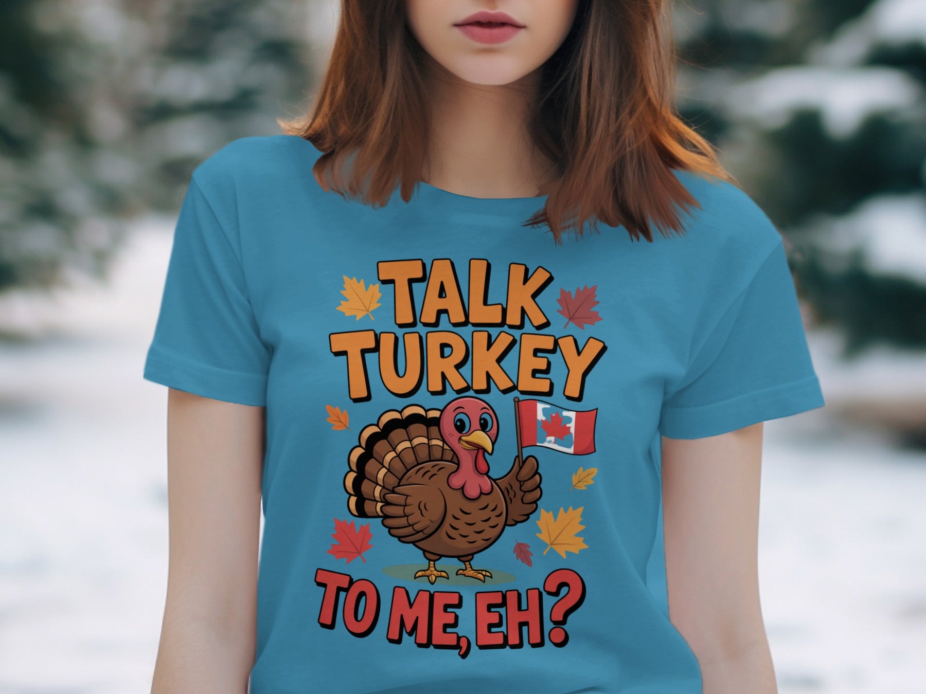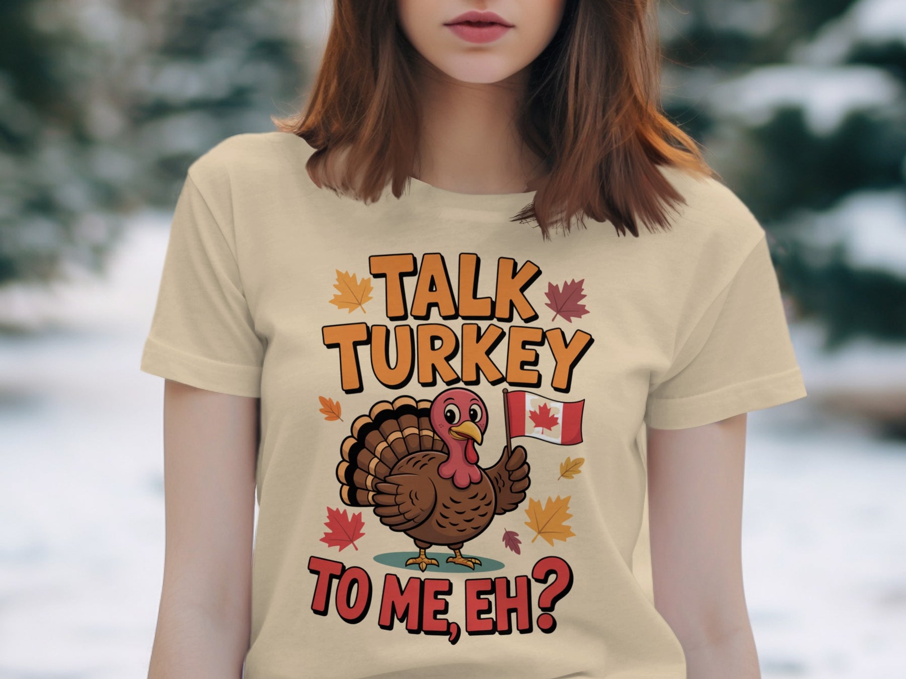 Women’s Thanksgiving T-shirt with a playful Canadian twist. A cheerful turkey waves a maple-leaf flag beneath the phrase “Talk Turkey to Me, Eh?”—a cute nod to both U.S. and 🇨🇦 feast days.