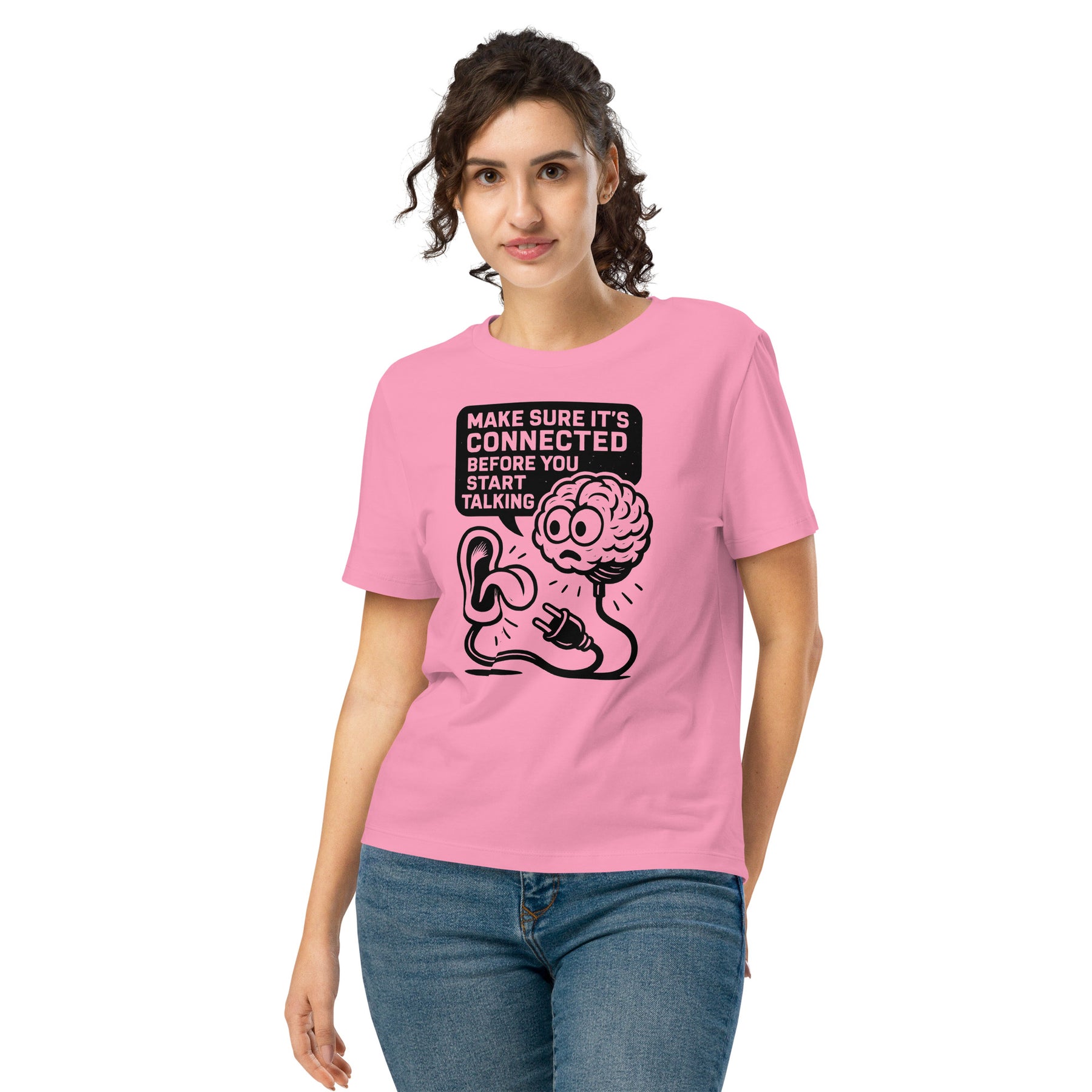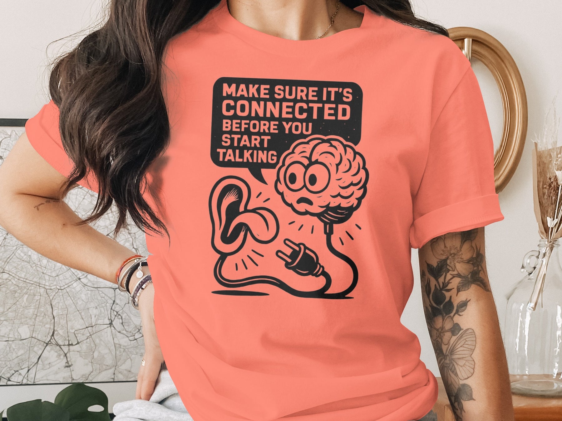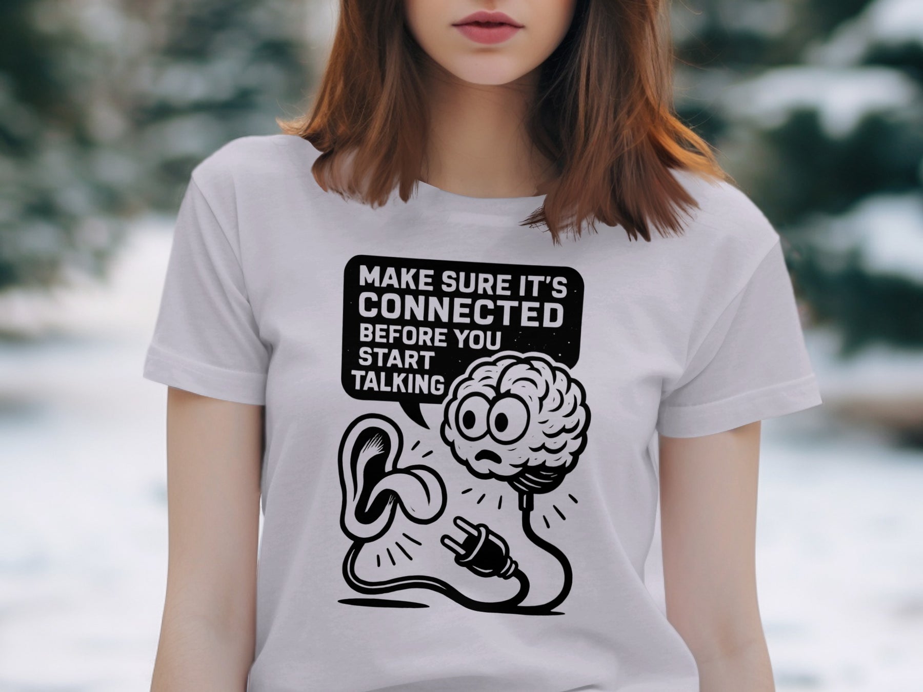 The vibe: outlined brain with a dangling plug aiming for an ear, plus the quip: “Make sure it’s connected before you start talking.” Clean, bold line art pops on any color and sparks instant laughs.