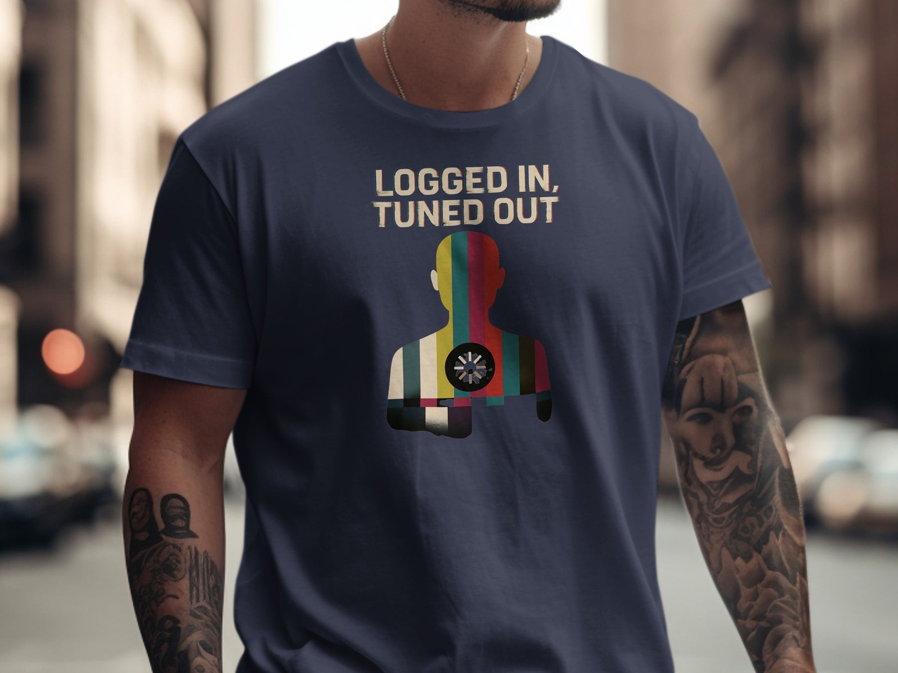 Logged In Tuned Out men’s t-shirt. A bold reminder to look up: a silhouetted figure filled with retro colour bars sits beneath the headline “Logged In, Tuned Out,” punctuated by a dial icon at the heart.