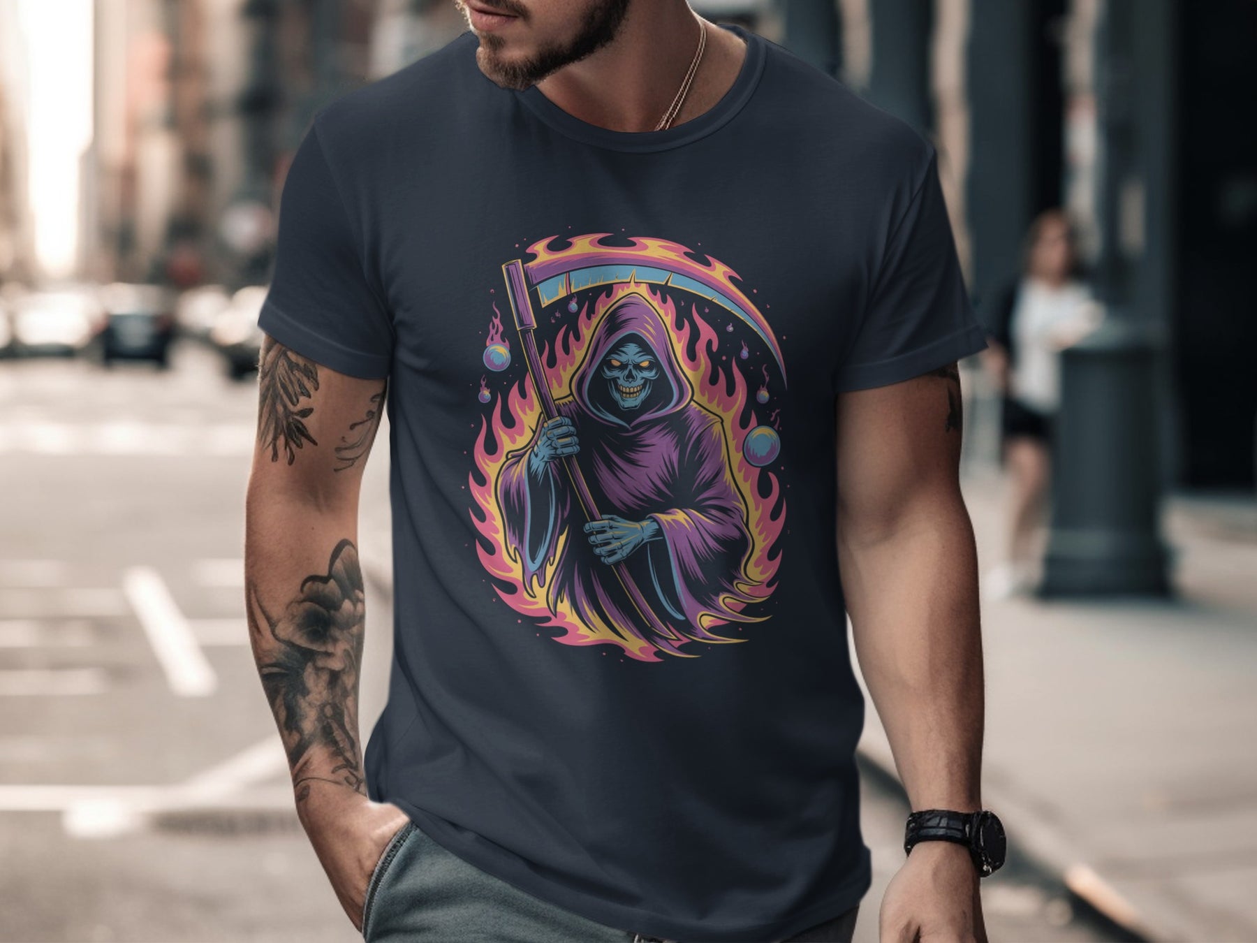 Men’s Halloween T-Shirt with “Neon Reaper Scythe” artwork. This Men’s Halloween T-Shirt ignites spooky season with a blue skull reaper in a violet hood, ringed by pink-gold flames and floating orbs, gripping a blazing scythe.