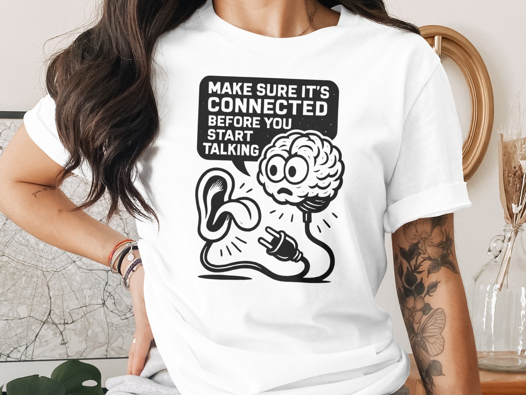 Monochrome line-art on black: wide-eyed brain with a dangling plug, an ear waiting for input, and a speech bubble that reads “Make sure it’s connected before you start talking.” Clean, bold, and readable from across the room—your think before you speak t-shirt pairs with denim, leggings, or joggers.